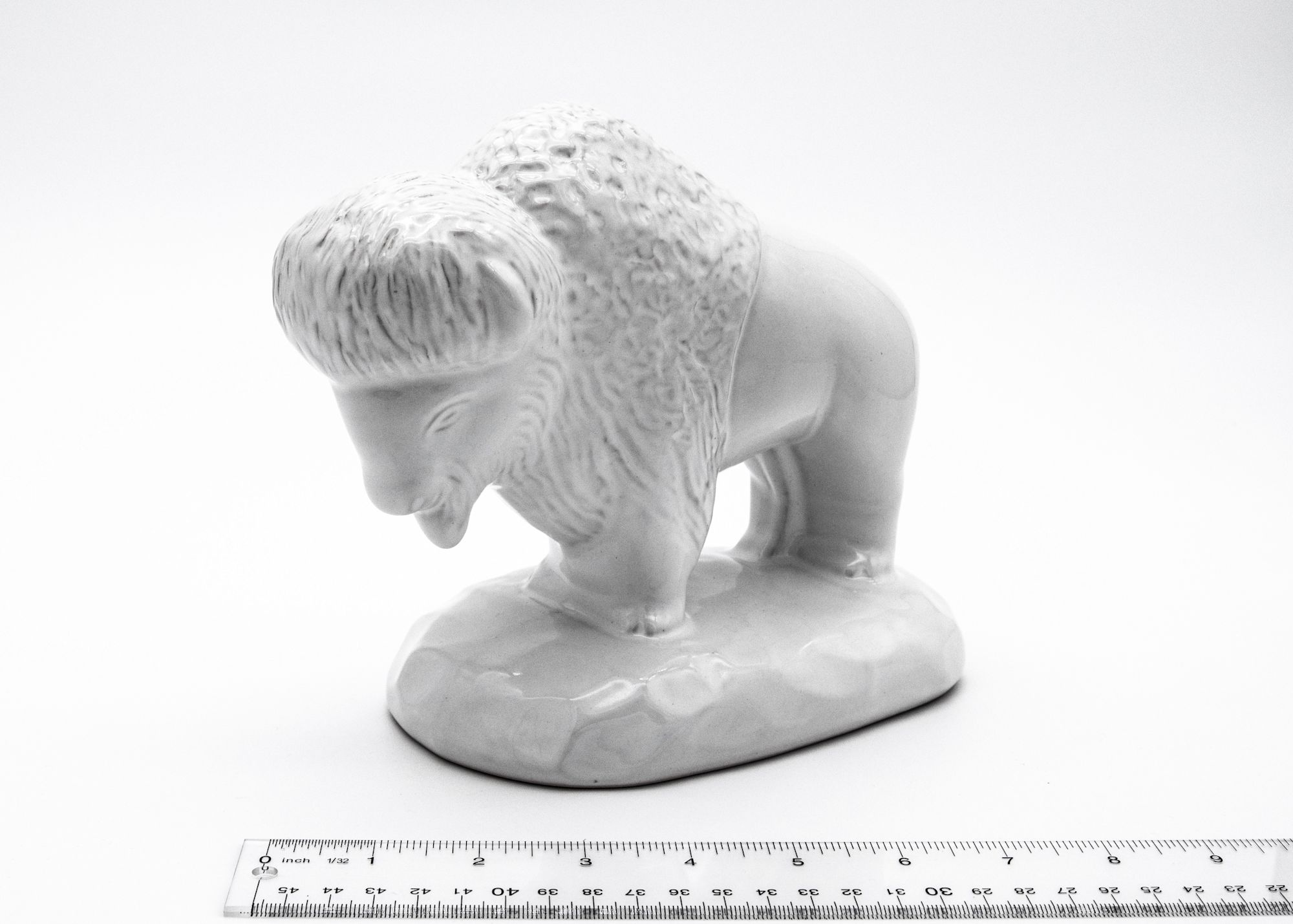 Vintage Frankoma white buffalo (bison) statue. Terracotta figure has a glossy white glaze. Base is impressed with Frankoma mark and Joniece Frank signature. Stamped with an edition number of 140.