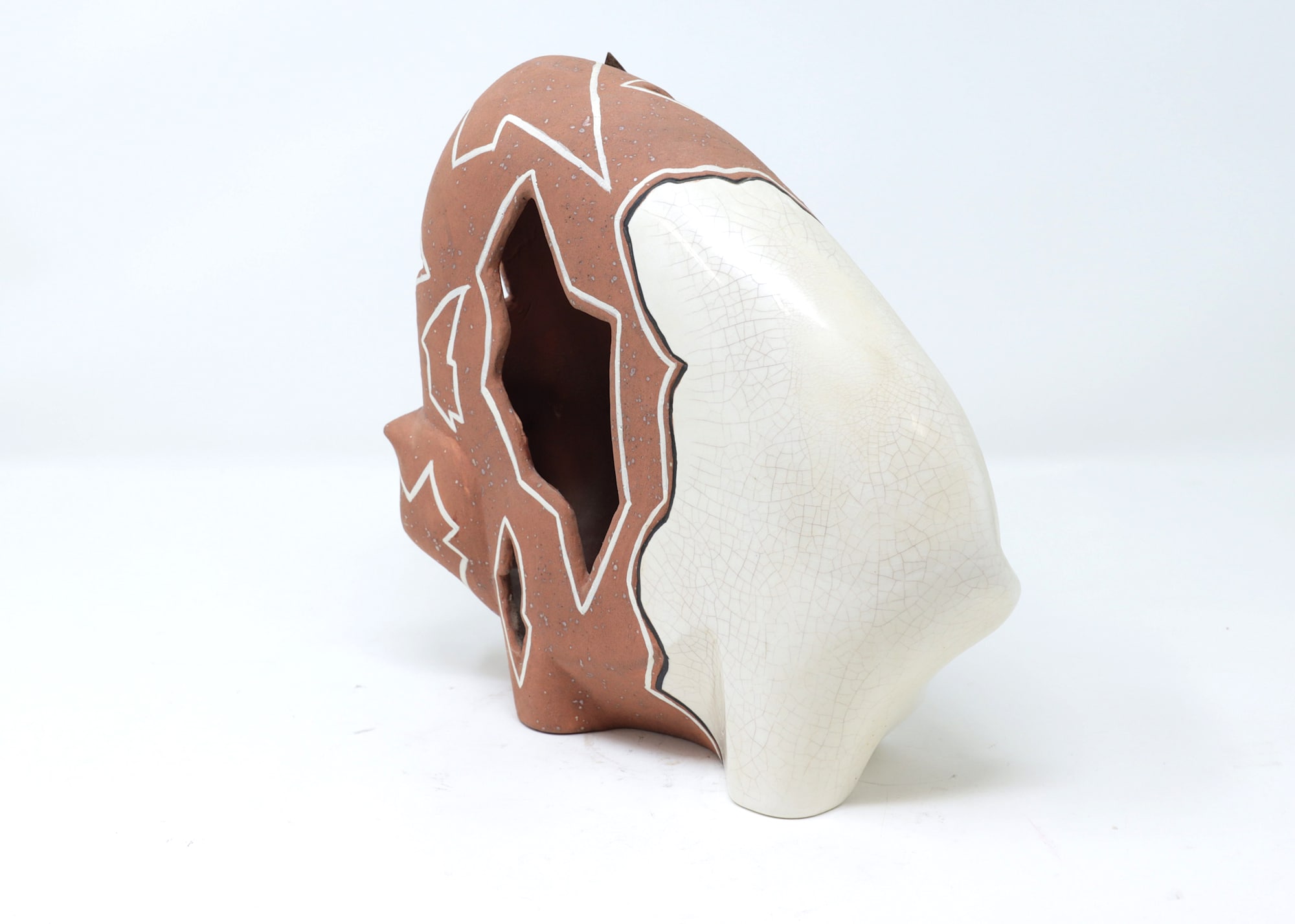 This handcrafted bison figurine exemplifies mid-to-late 20th century Southwestern pueblo pottery traditions, likely New Mexico Pueblo (possibly Jemez, Cochiti, or Santo Domingo). The piece is constructed from traditional red terracotta clay with cream-colored slip applied to one side, creating the distinctive two-tone aesthetic characteristic of pueblo ceramic art. The terracotta portion features hand-painted white geometric designs in traditional patterns, accented with turquoise stone inlays—a signature element of Southwestern Native American decorative arts.