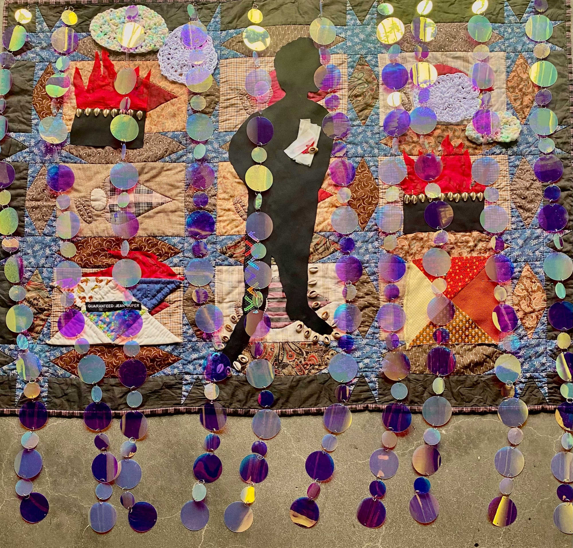 This piece shows an unidentified man murdered during the Tulsa Massacre in 1921. This handmade quilt made with vintage fabric pieces was made by me to honor this victim of the Tulsa Massacre. His picture was taken by the Tulsa Archives and it shows he was shot pointblank directly through his heart. I used the conch shells on his body to show that when he passed over, he went straight back to the his African ancestors.