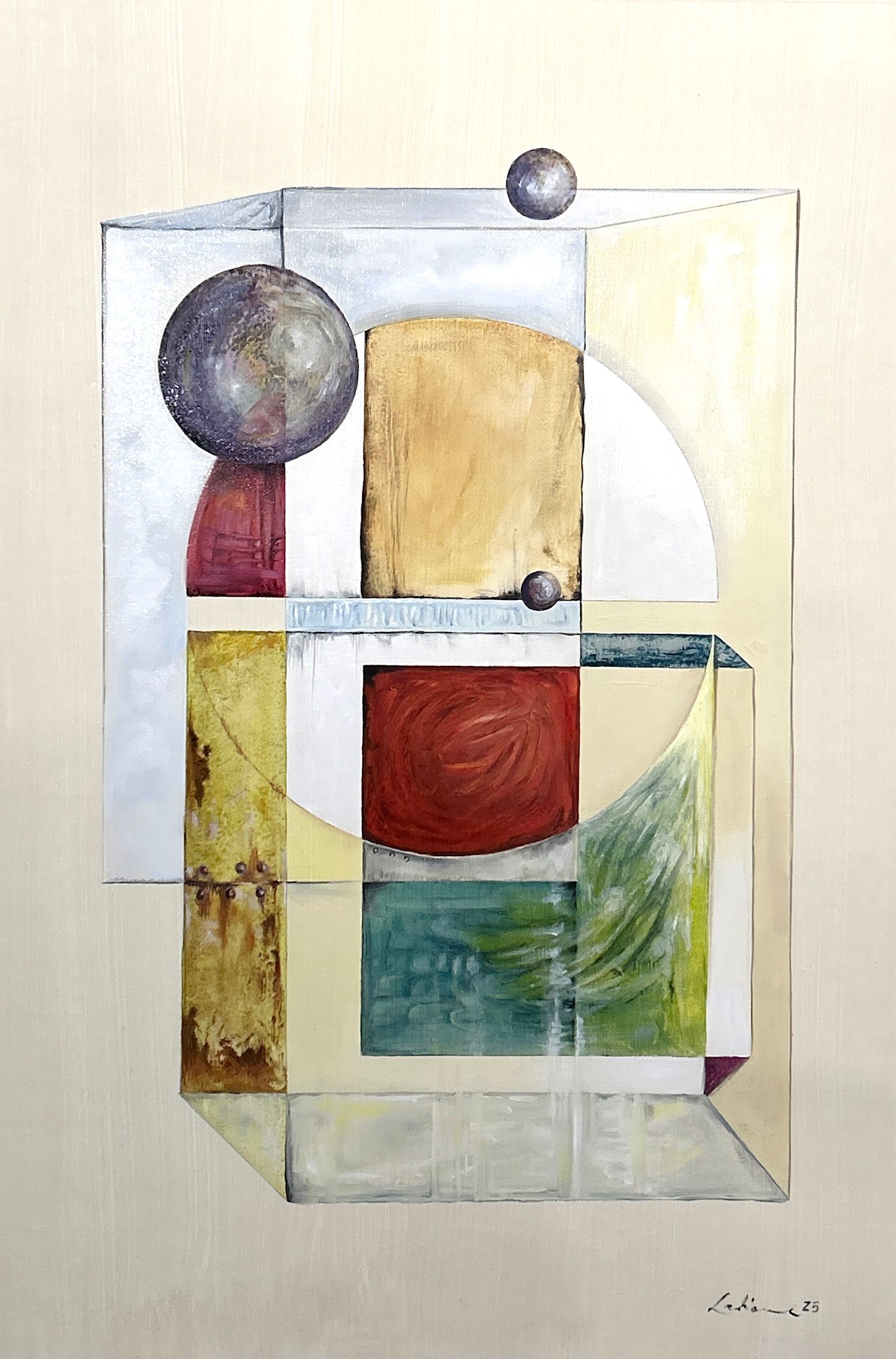 “Pavanne” Oil, acrylic, and graphite on canvas. 20x24 inches. This is the second of the two pieces I began several months ago. For this work, I did further exploration of the textures of sound in the track named Pavanne performed by Ahmad Jamal. The track is crisp, and tight at the outset, and uses hits of asynchrony in the middle, playing with percussion as counter to keys. Here is a link to Pavanne: https://youtu.be/4482EKl0a0w?si=fIdHu4fBwma6tKkV