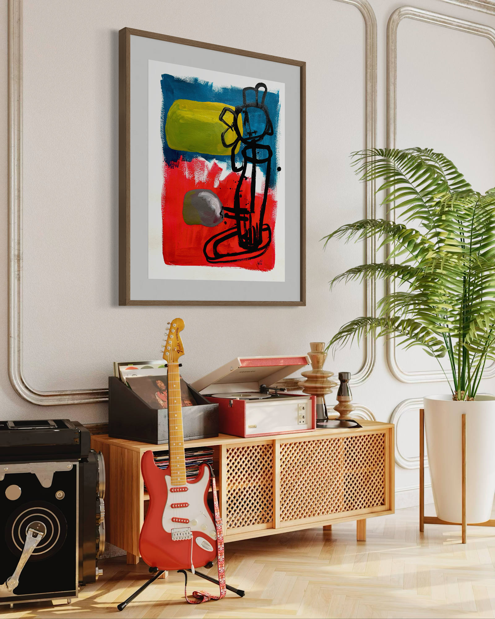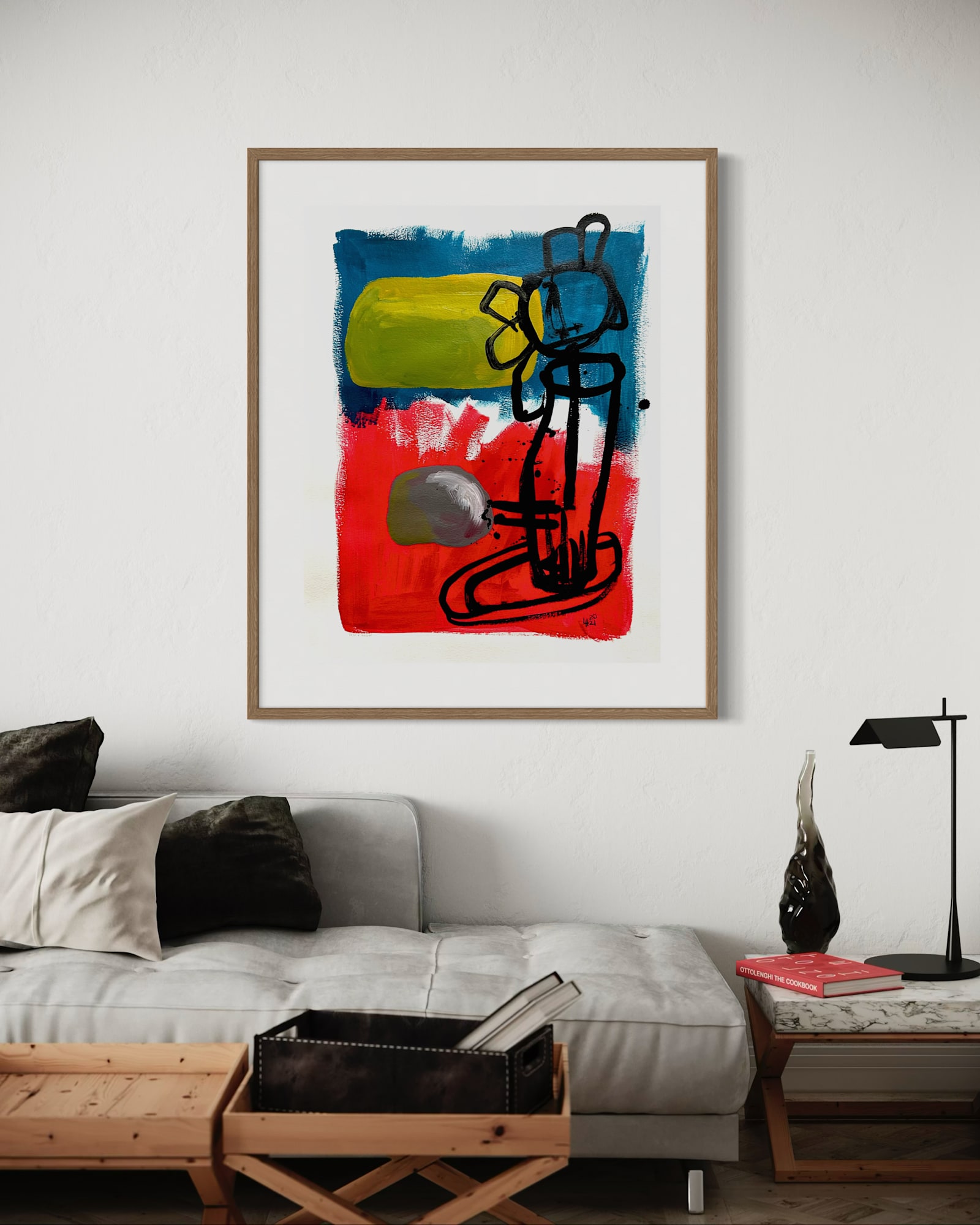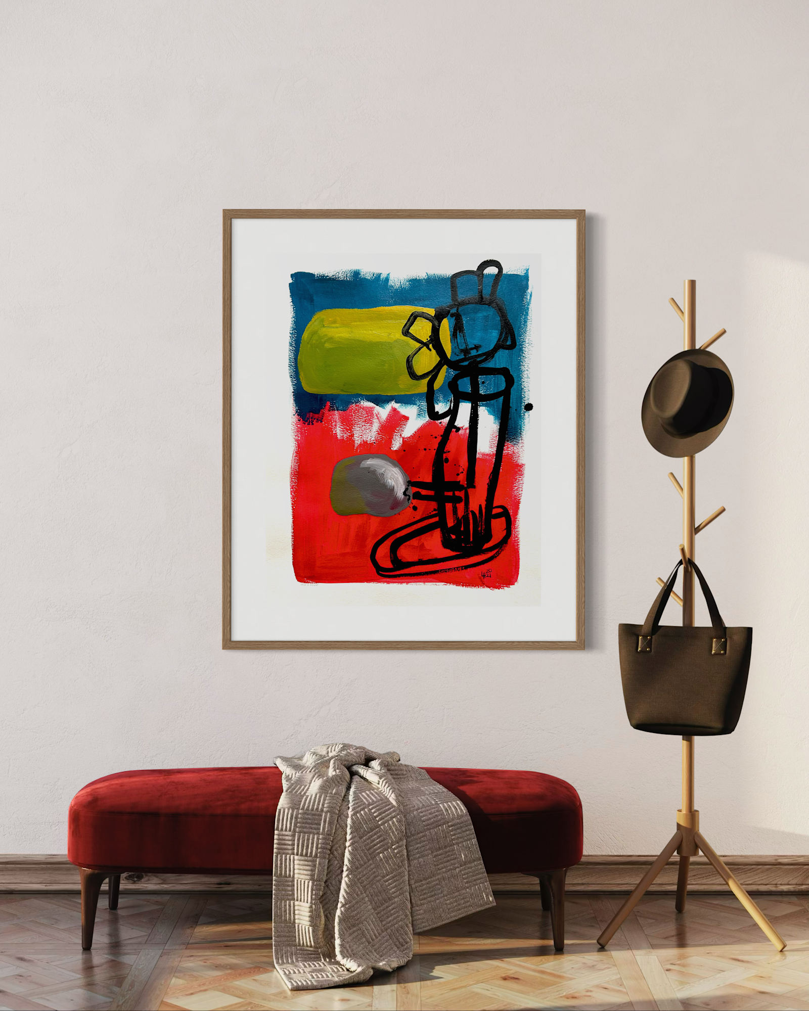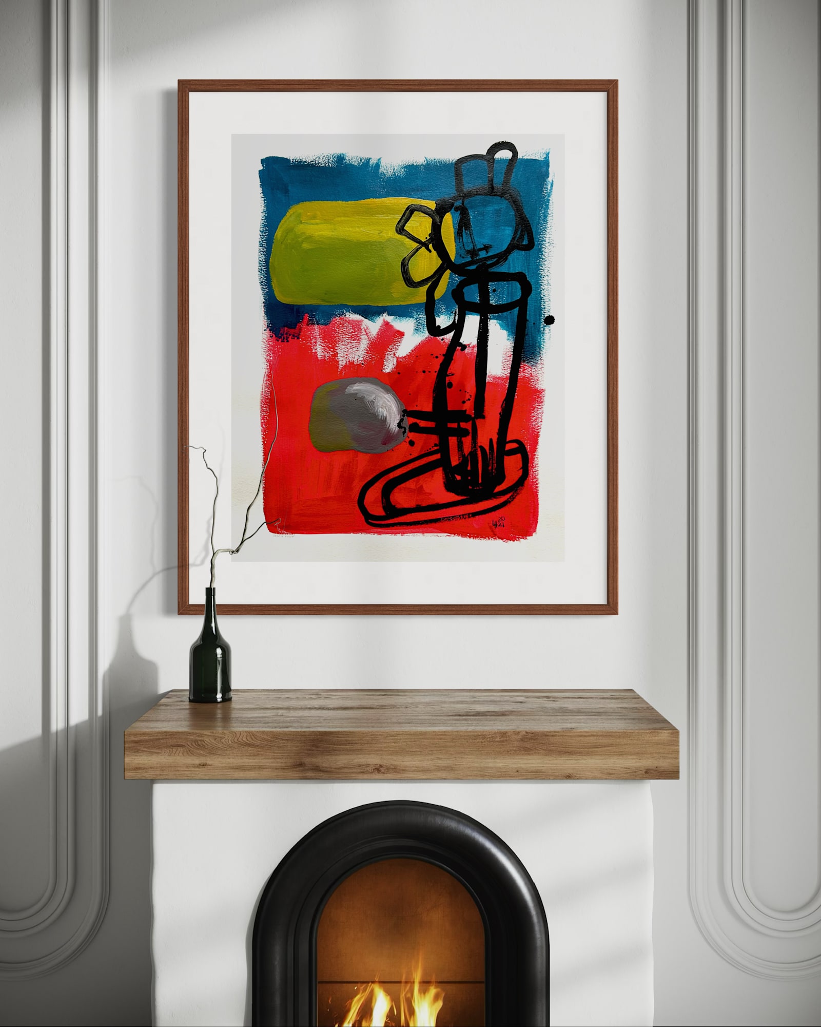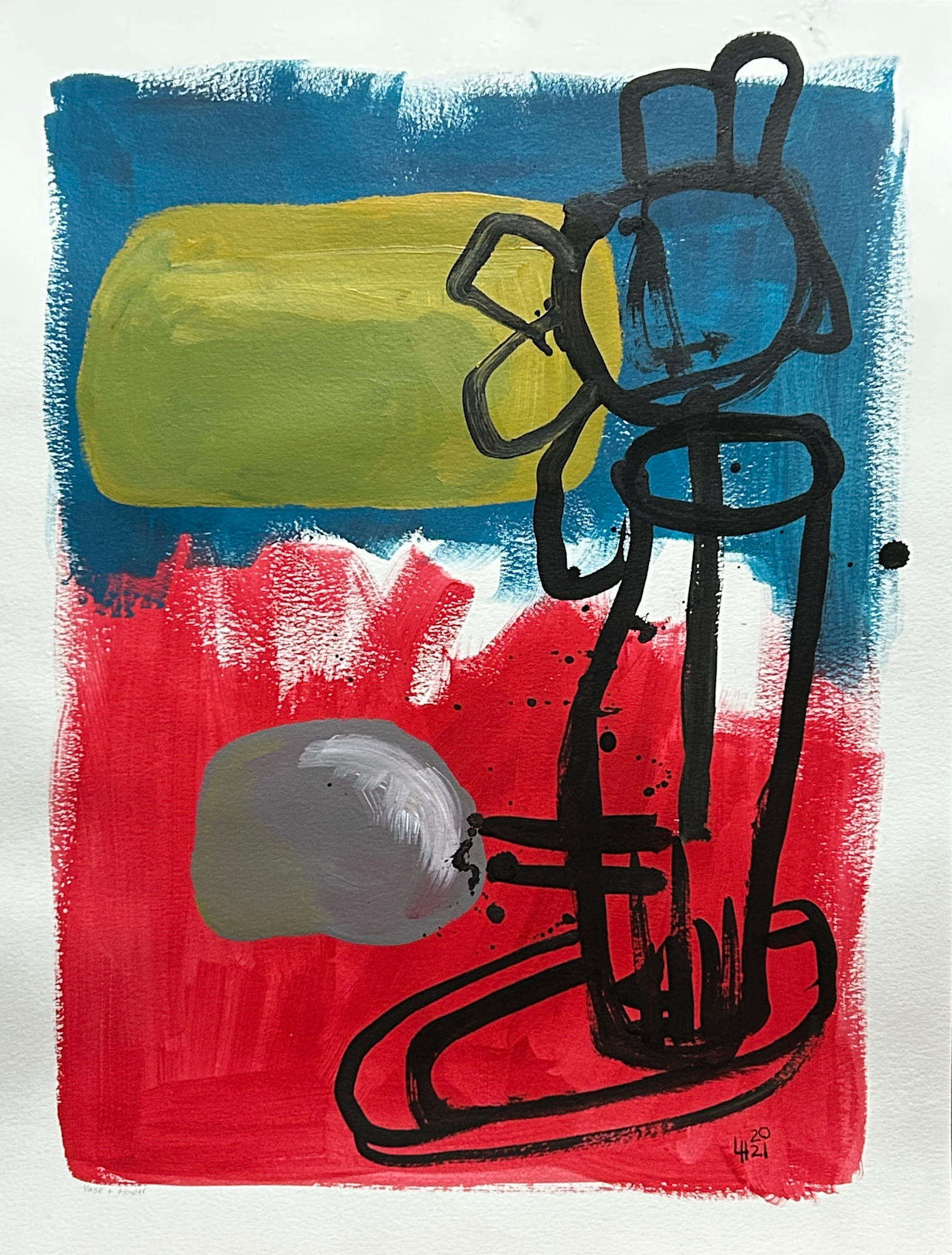 Rocks in the Garden is an abstracted still life, using an outline of a rudimentary vase, with an abstracted flower as metaphor for the things we hold dear, and the rougher objects, moments, and people we encounter. Note: Unframed. Shipping not included.