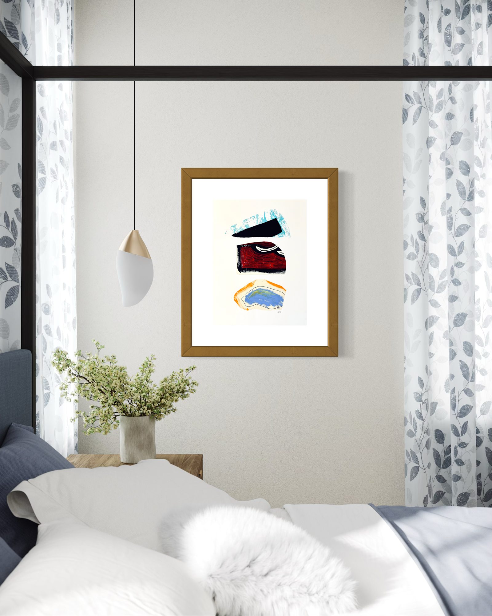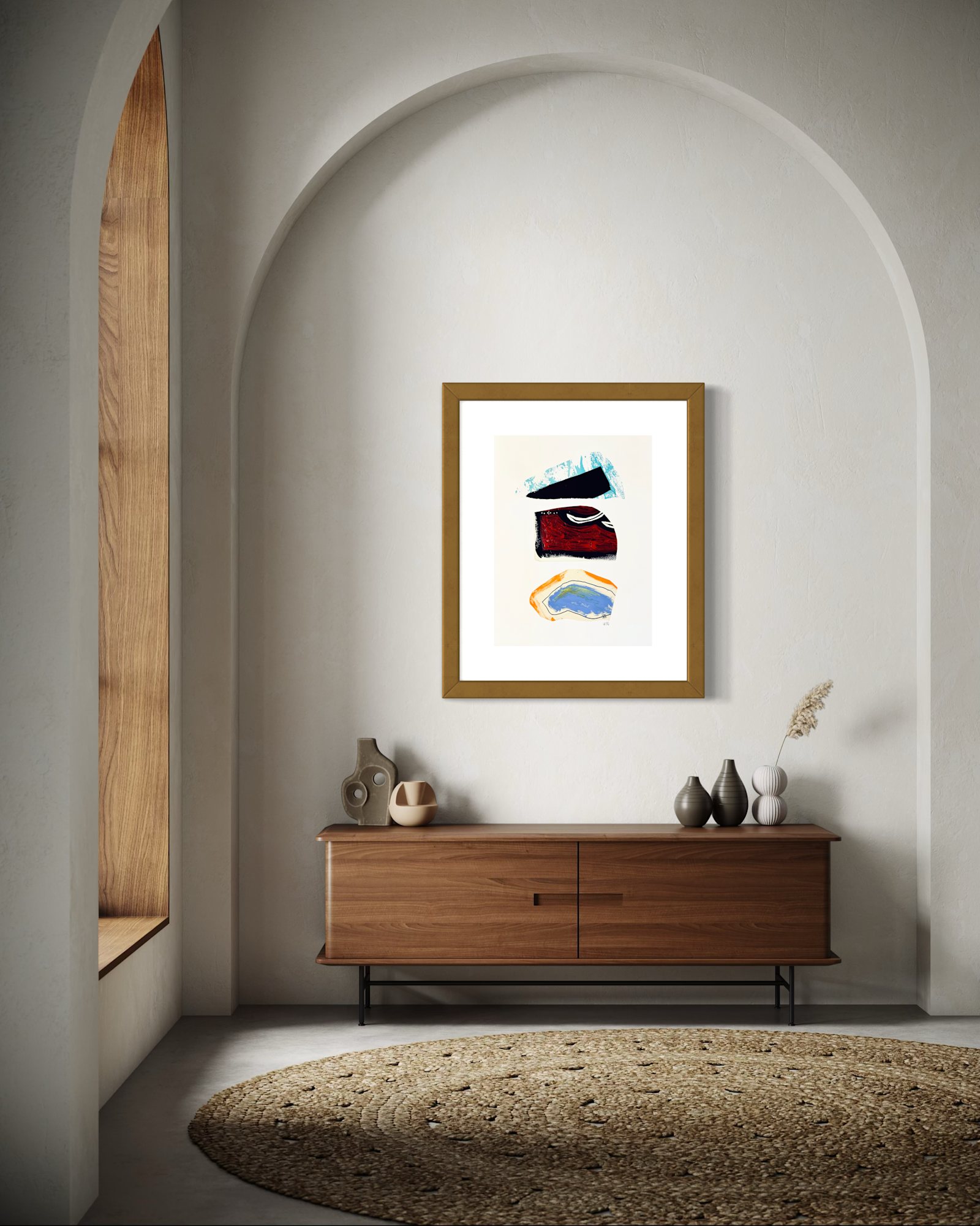 In the artist's signature language, this piece uses mixed media to present us with abstracted forms. The lower form, an underground water source, the manmade world and its natural surroundings in the red, central form, and the spring from which comes the metaphorical water of possibility.