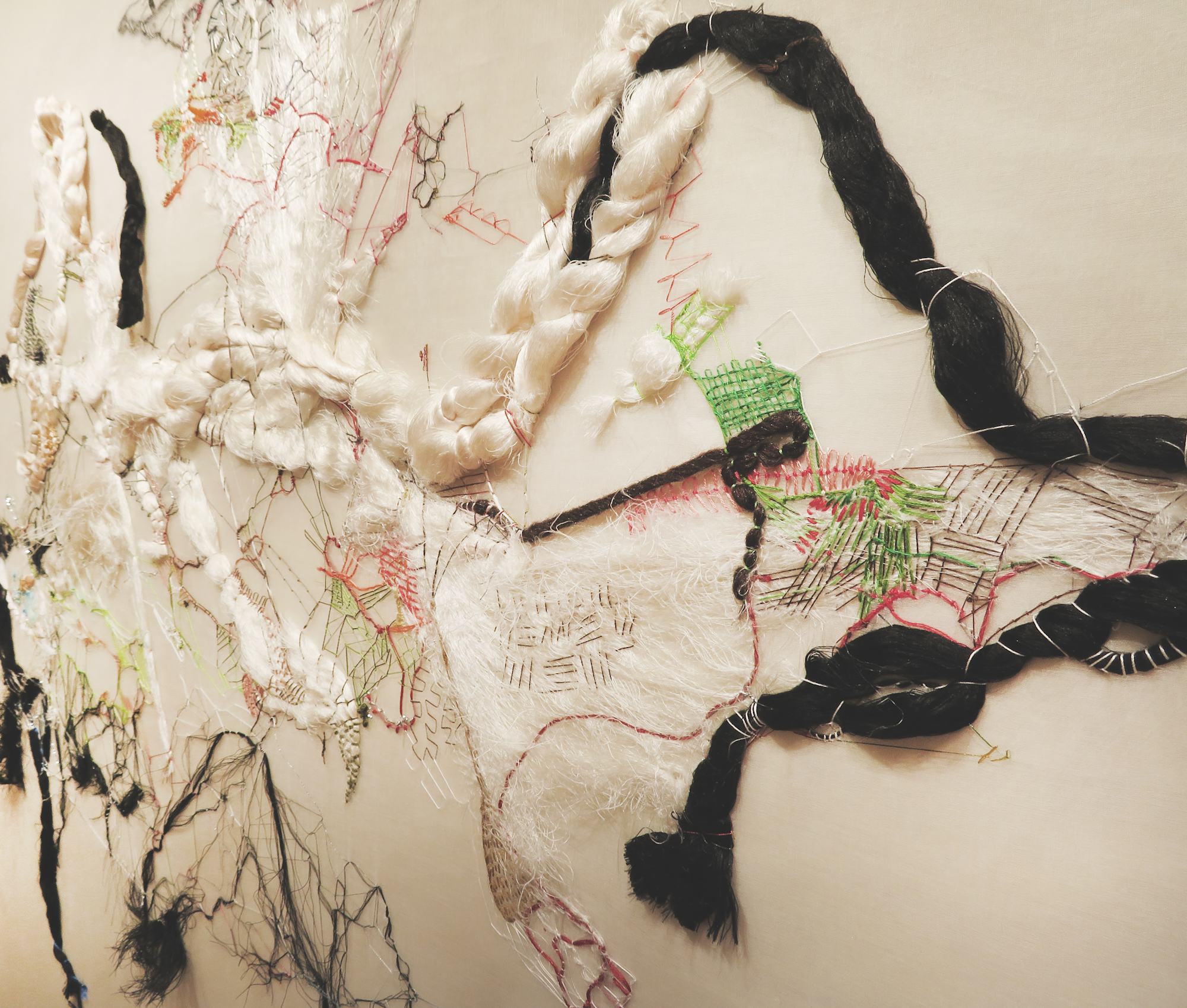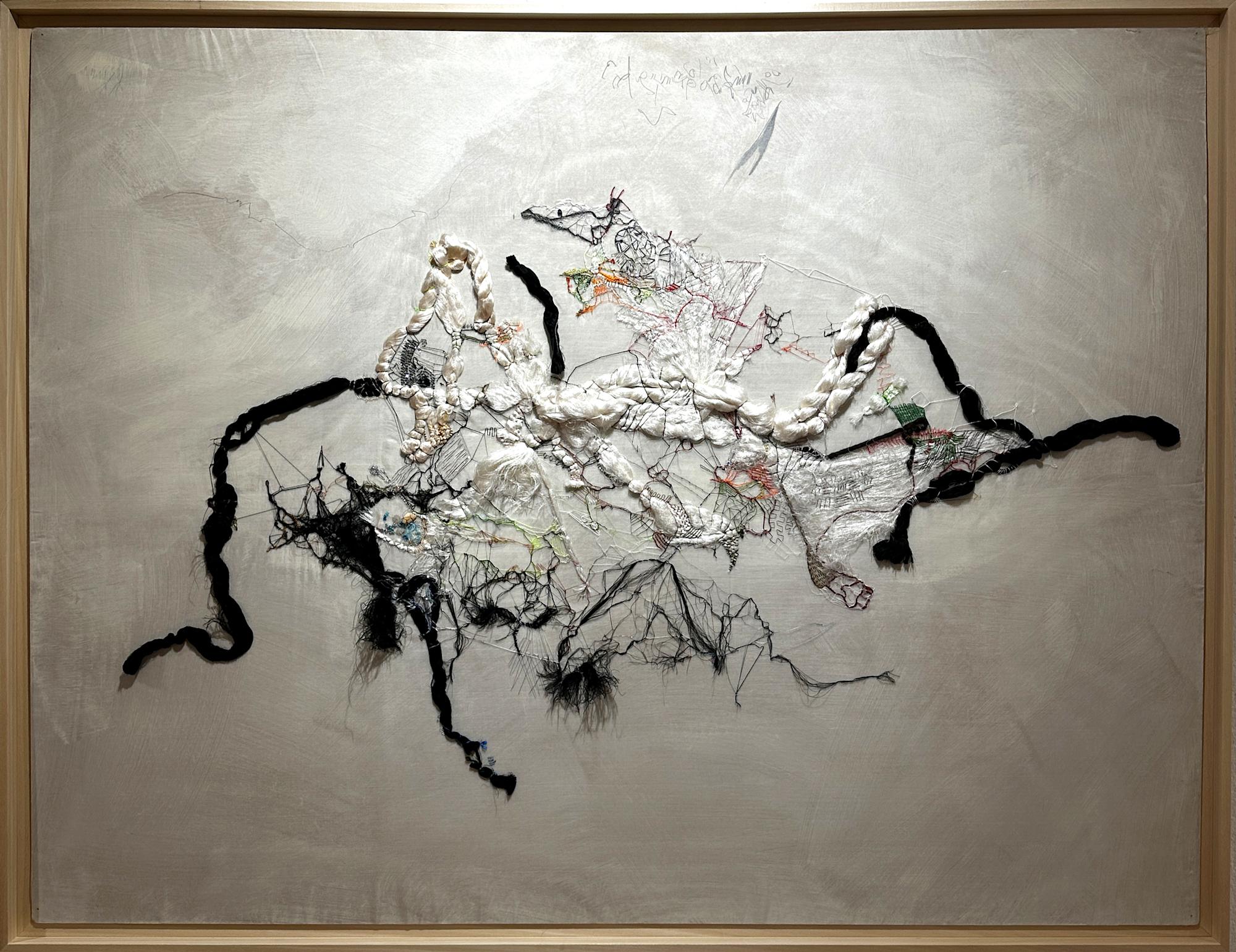 Experimentelle Stickerei mit modelliertem Seidenstrang, diversen Fäden, Garnen, vereinzelten Pailletten und Perlen auf Seiden Organza. Auf bemaltem (Acryl) MDF montiert