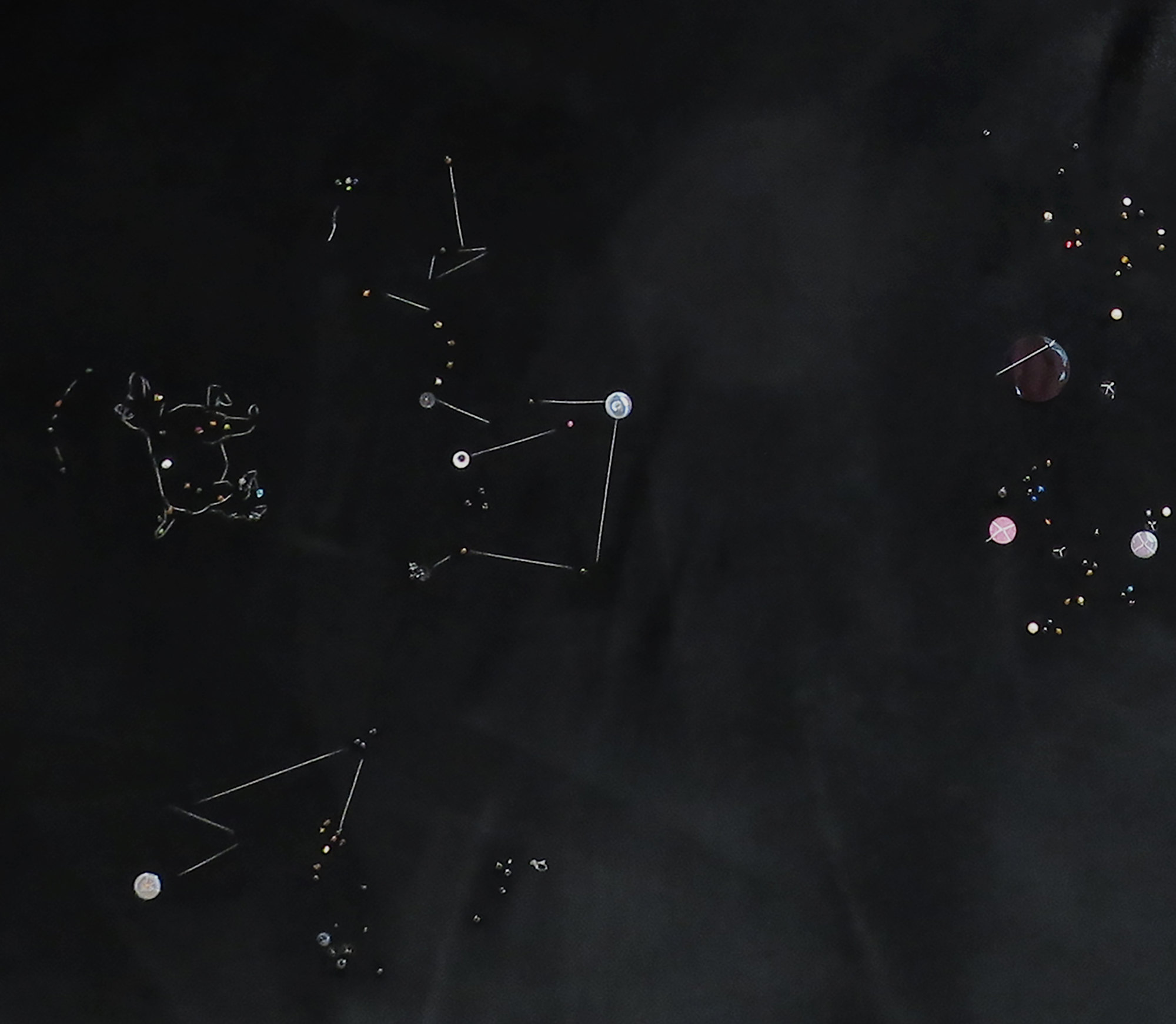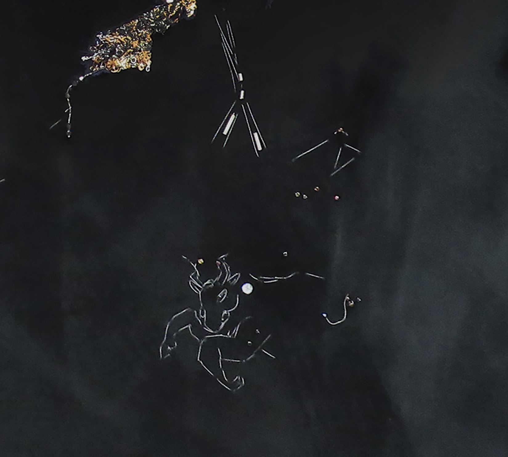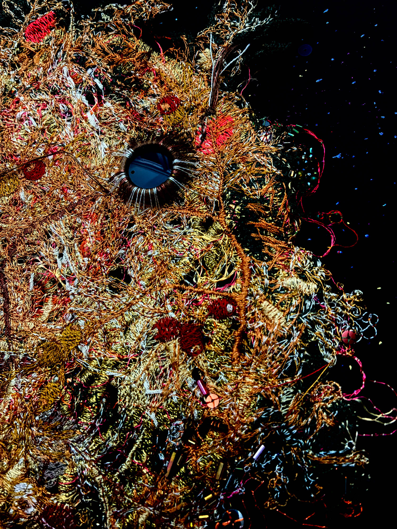 Applizierte Ausbrenner-Stickerei auf schwarzem Baumwollsamt, Handstiche teilweise mit reflektierendem Garn gestickt, Viskose Garne, Pailletten, Glasperlen, Muschelstück