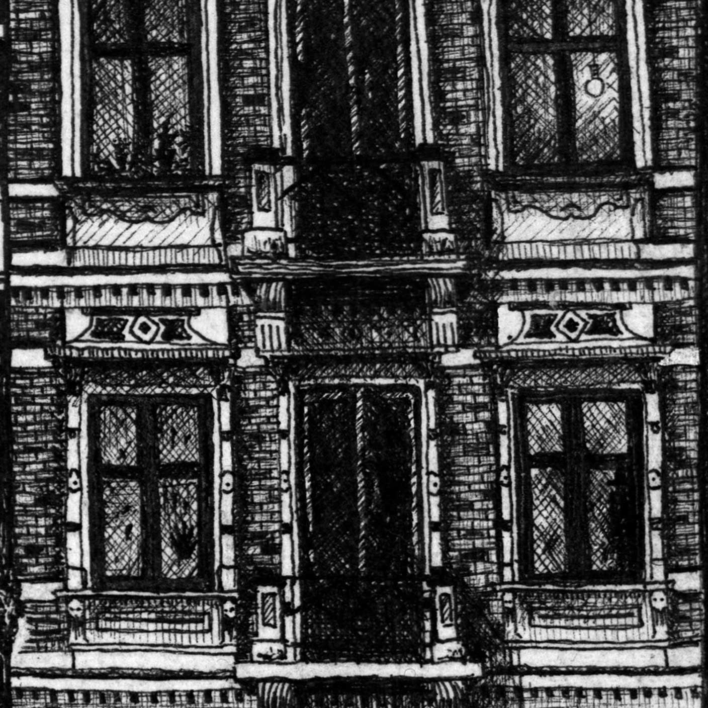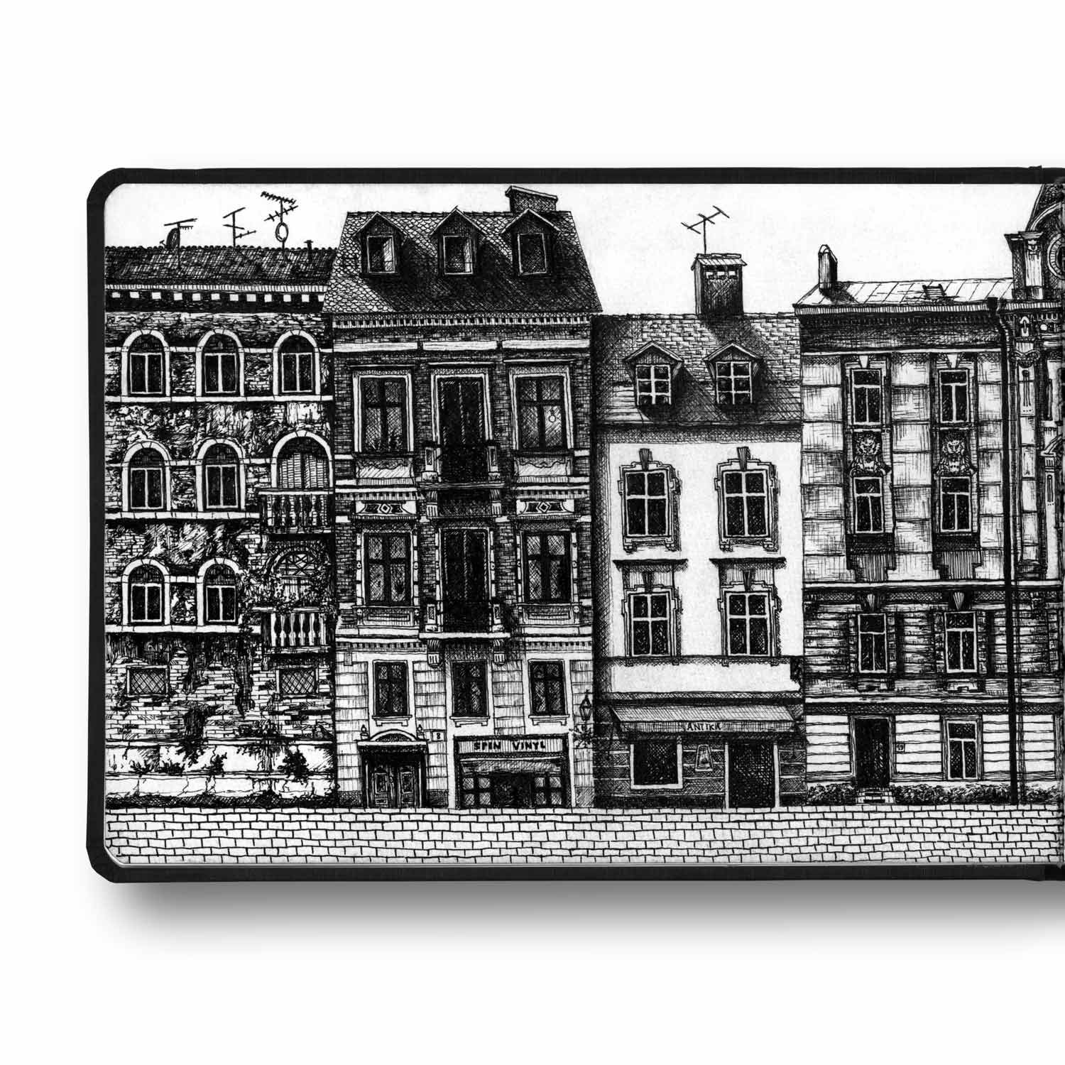 Das Original-Bild entstand auf dem Interrail quer durch Europa. Jedes Haus der Strasse stammt aus einer Stadt der Reise: Venedig, Trieste, Ljubljana, Budapest, Bratislava, Wien, Pisa (v.l.n.r.).