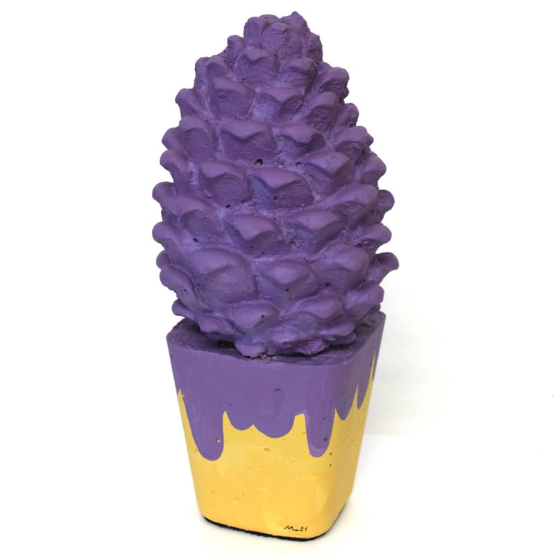 Der Tannenzapfen ist ein wiederkehrendes Thema im Werk von Marina Lutz. Als Fortpflanzungsorgan der Nadelbäume sind sie Symbol für Fruchtbarkeit und Unendlichkeit. In der Serie «Variations of a pine cone» spielt die Künstlerin mit verschiedenen Farben und Formen – unter anderem auch um verschiedene Konnotationen zu erzeugen, welche von der gängigen Verbindung zu Weihnachtsdekoration abweichen. Das harte Material Beton bringt Lutz in eine organische Form.