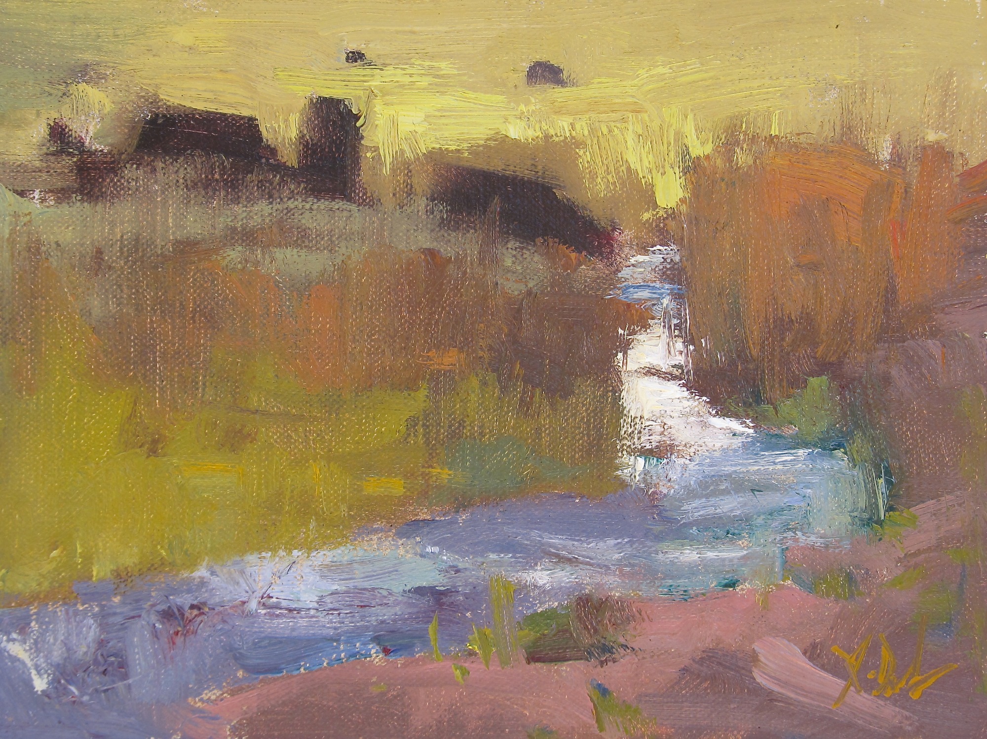 Plein air oil on linen/panel. Painted at Crane Hollow Road, Boulder County CO, of cows drinking from the irrigation ditch.