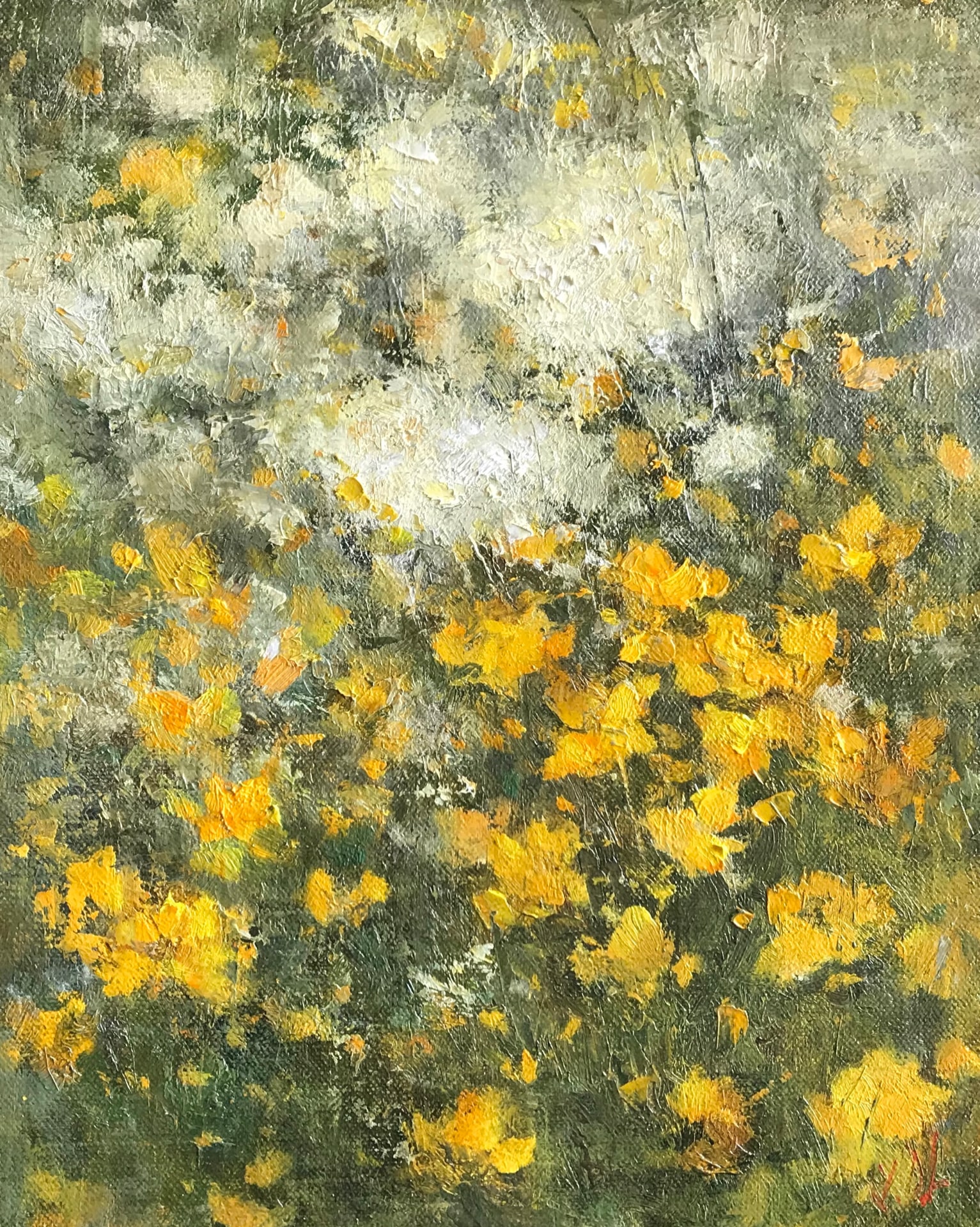 A place of enchantment, in the midst of a secluded, shady patch of buttercups and other wildflowers. 10 x 8" oil on linen/panel. Plein air, finished in studio.