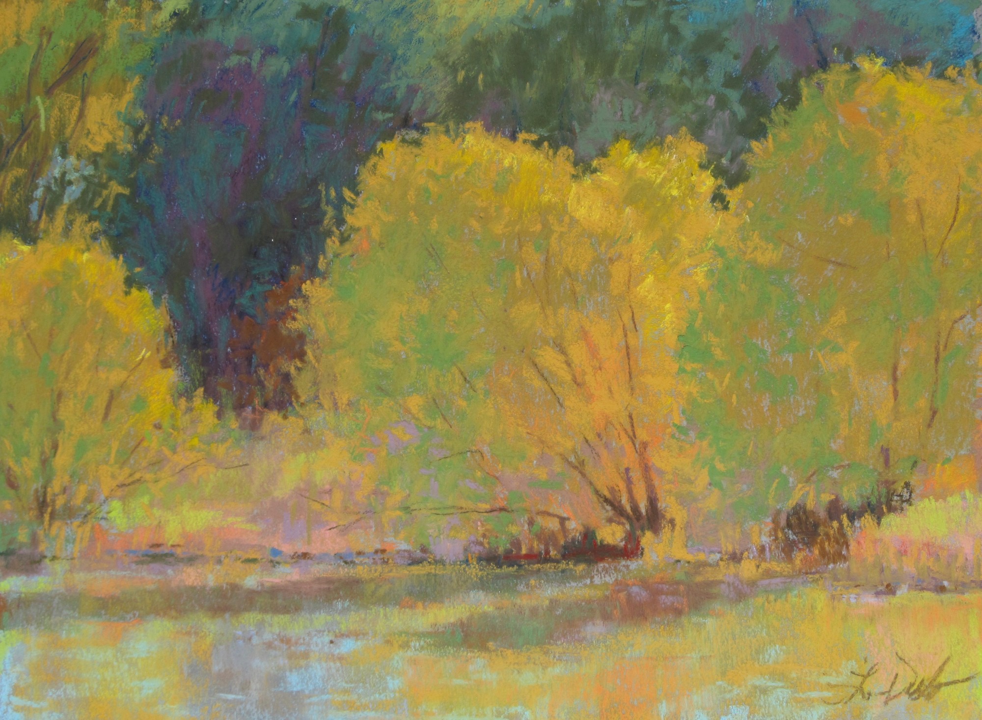 Brilliant Autumn greens and golds melt into reflections. 8 x 11" pastel, plein air. Painted at Dodd Lake, Niwot, CO.