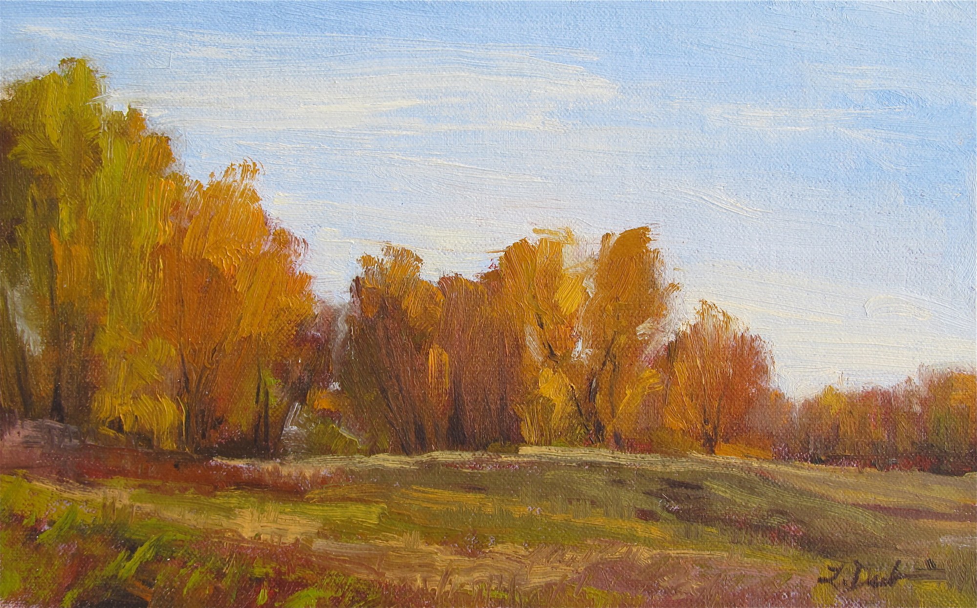 A row of trees on a hillside glow with a procession of changing autumn color. 6x10" oil, plein air. Painted in Niwot, CO, Dry Creek Trail.