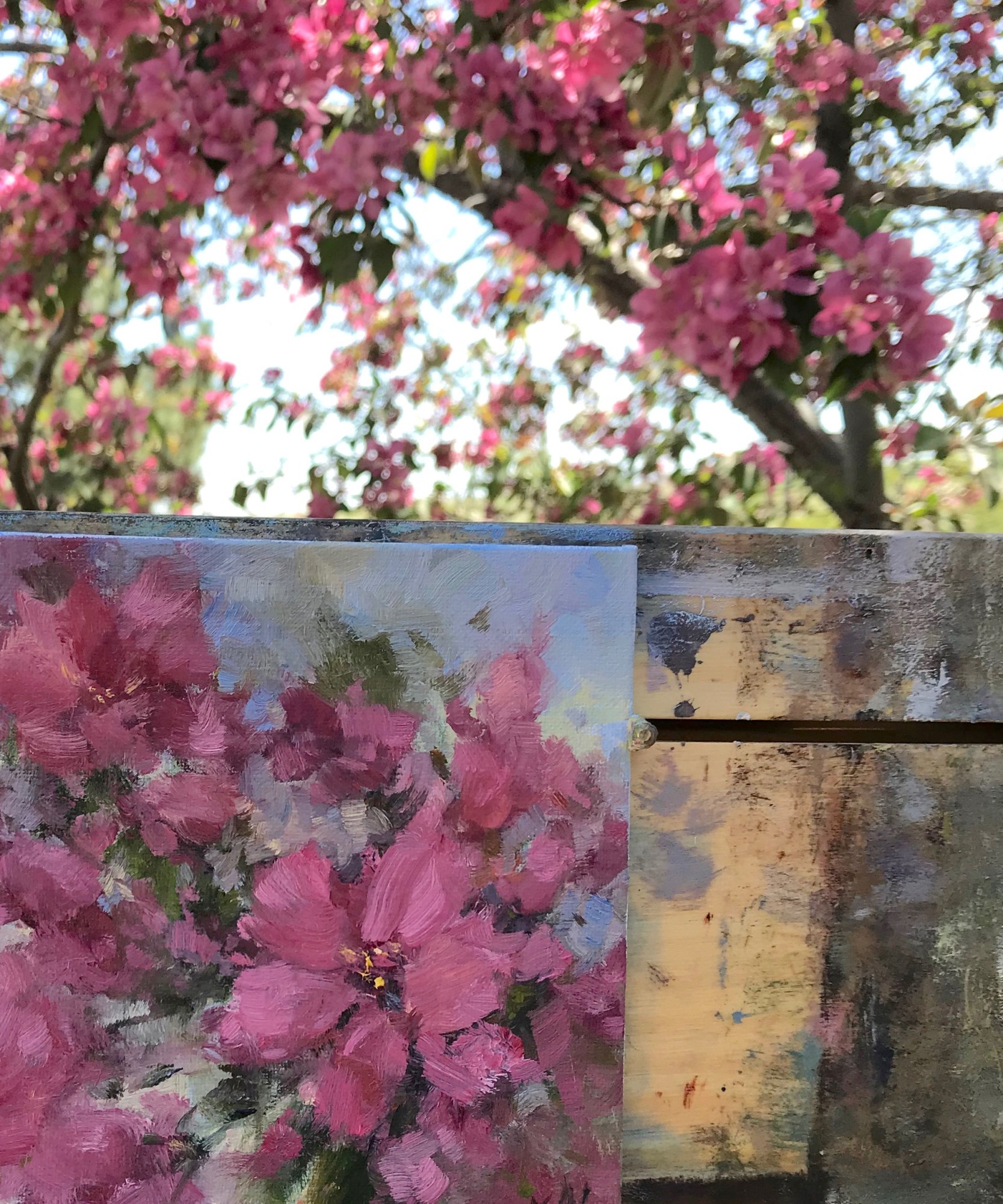 A Brandywine Crabapple tree bursts into bloom on a sunny Spring day. 6 x 6″ oil, plein air. Painted from our backyard deck.