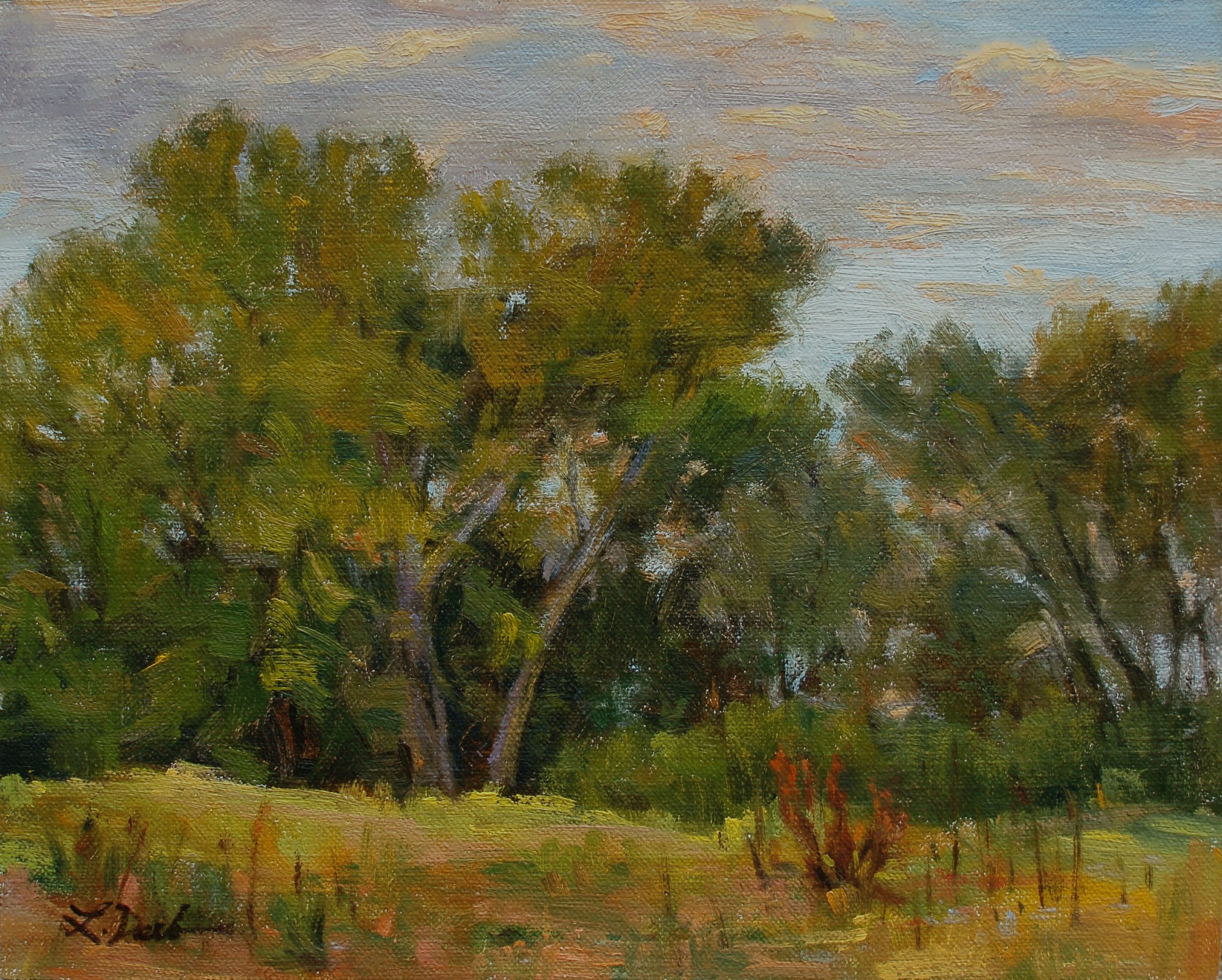 Evening Light gives a glow to a stand of Cottonwoods. 8x10 oil, plein air. Painted at Cottonwood Trail, Boulder.