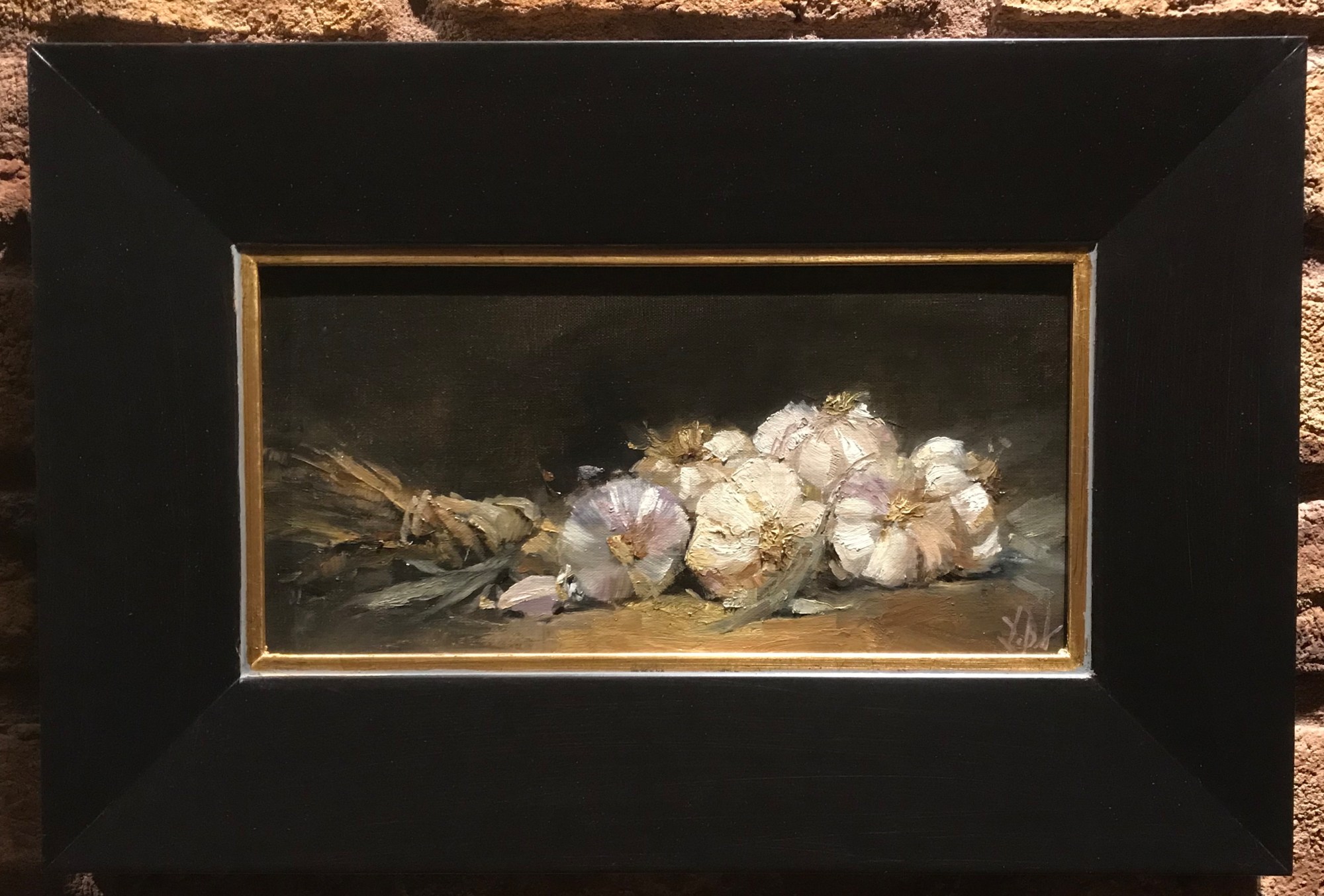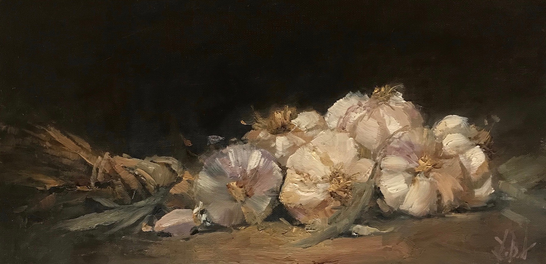 Light and color dance along a garlic braid from the Farmers Market, seasoned with a few sage leaves from my garden.