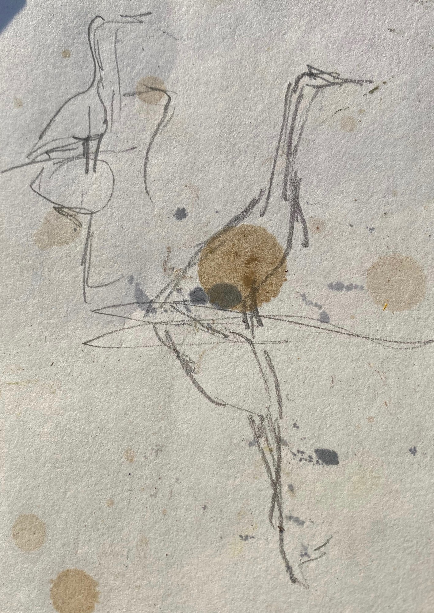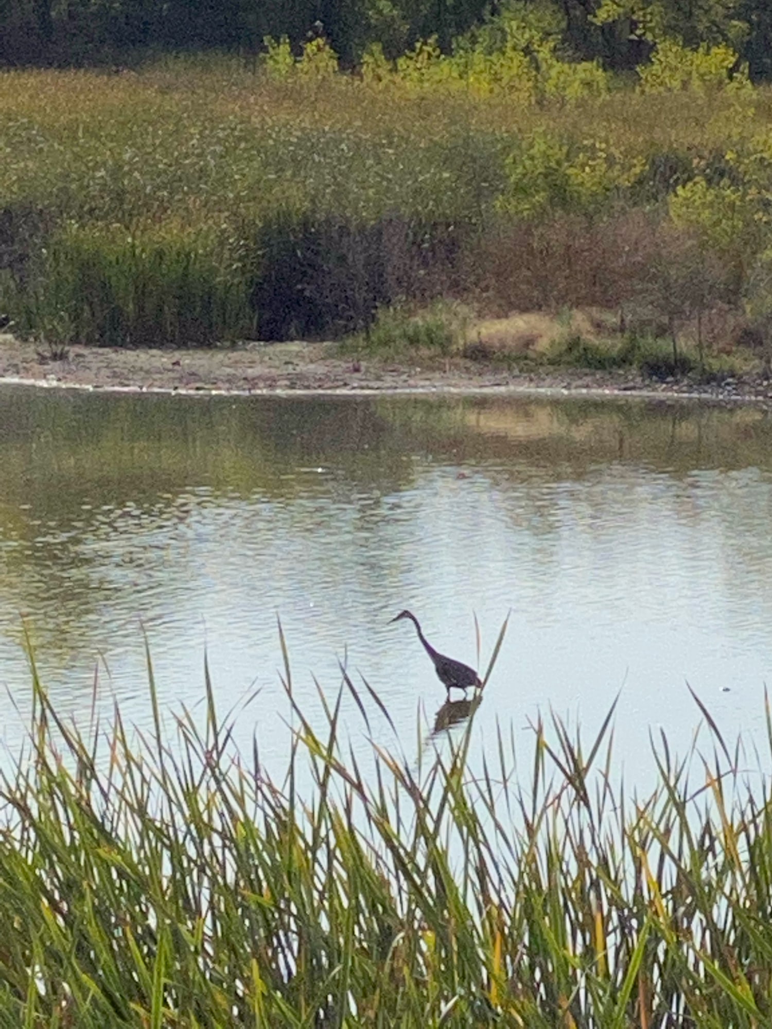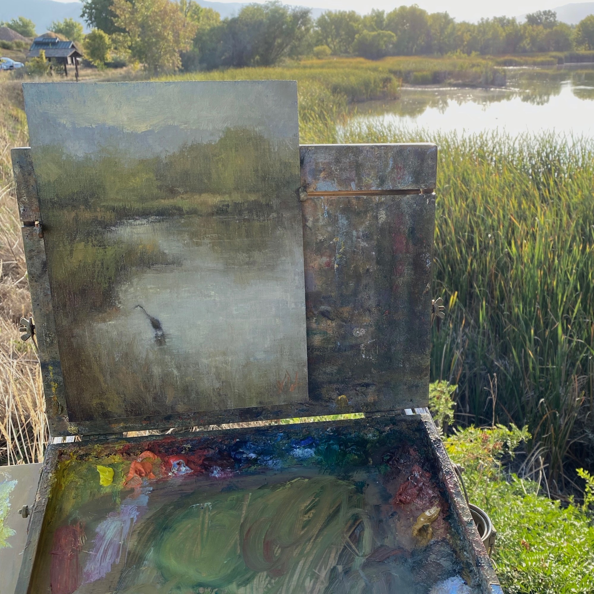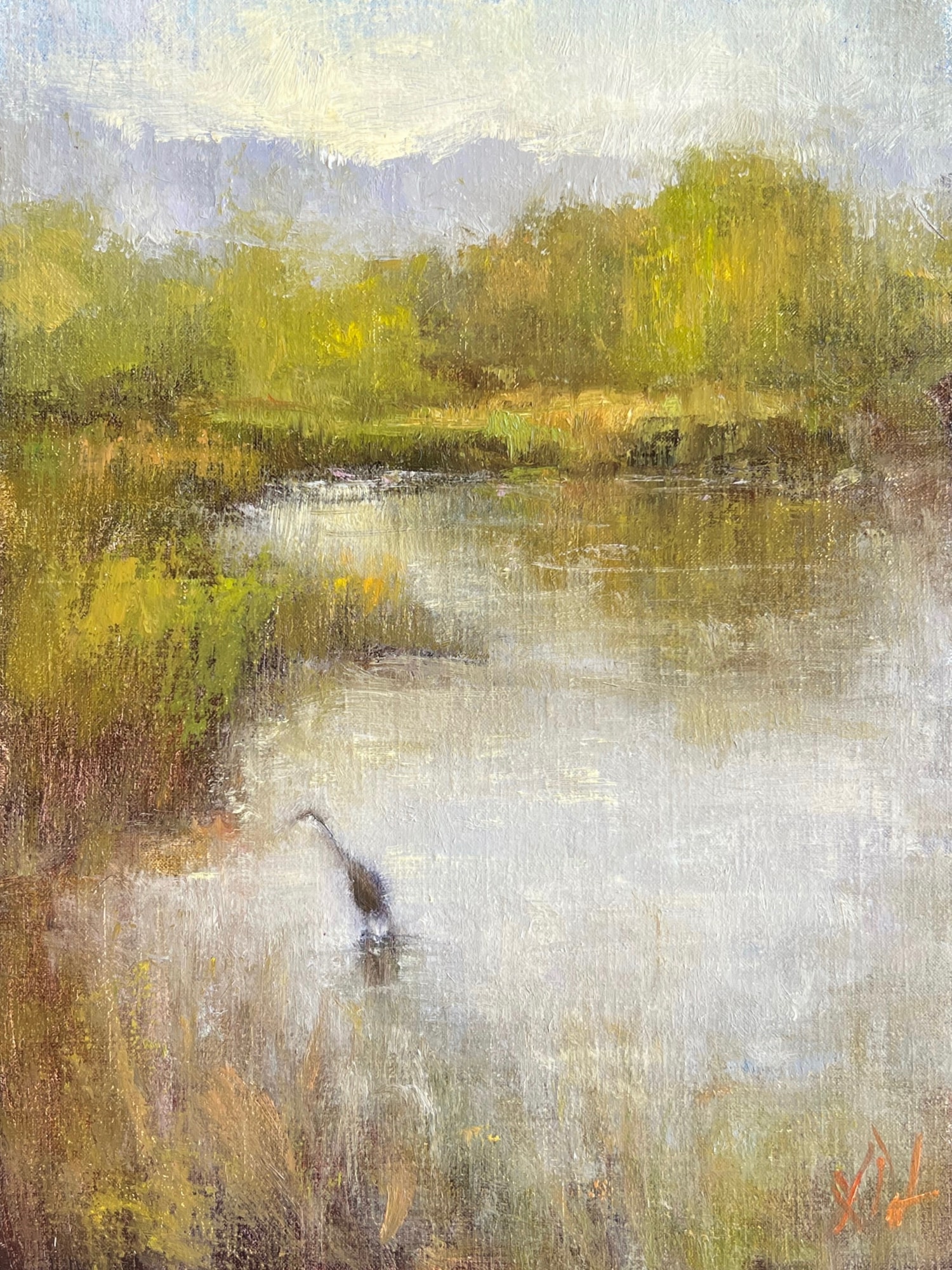 A Great Blue Heron wades stealthily among the reeds at Walden Ponds Wildlife Habitat. Painted on location, Boulder County Open Space