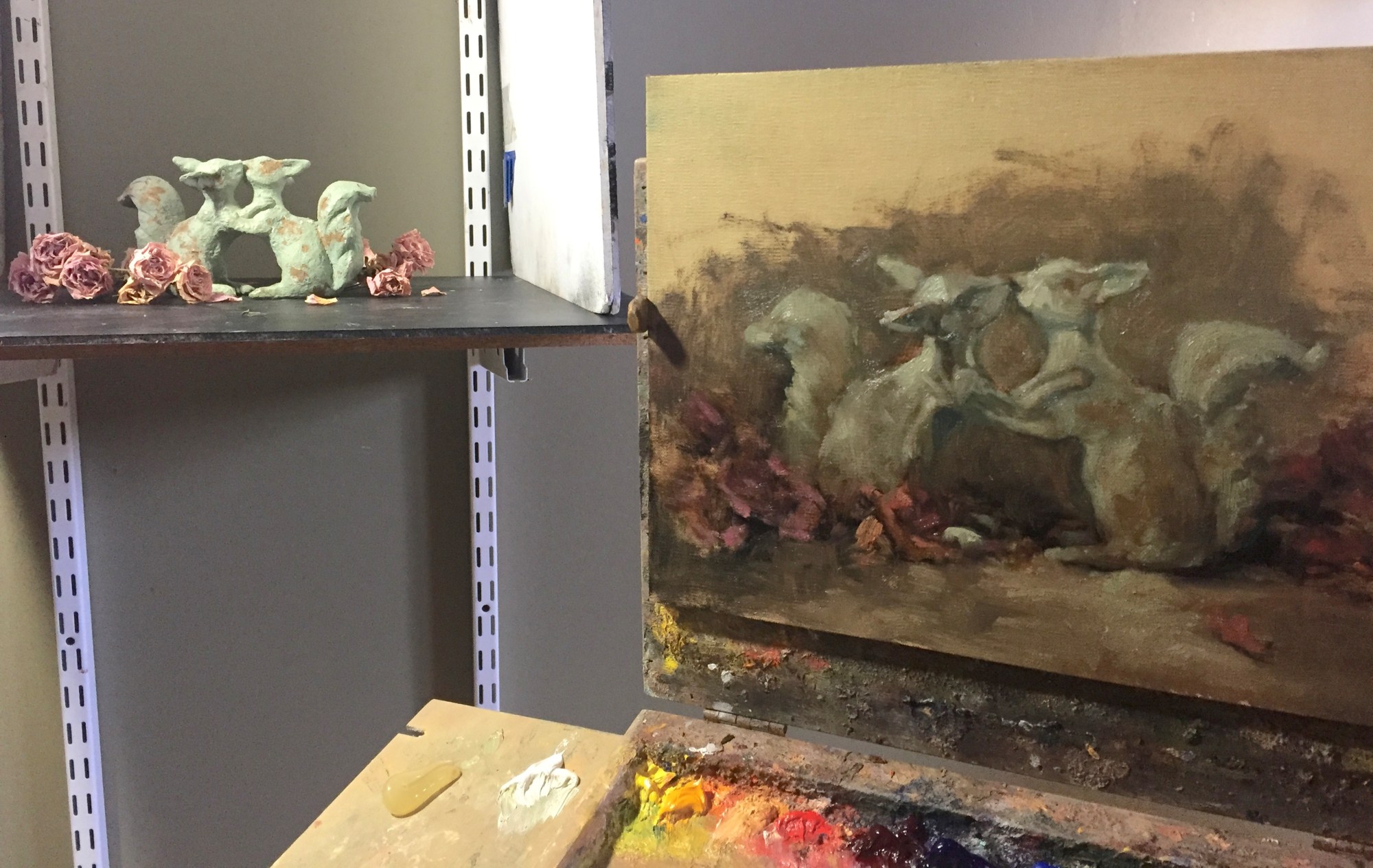 Love is in the air... a romantic statuette of kissing squirrels, surrounded by small, pink roses.