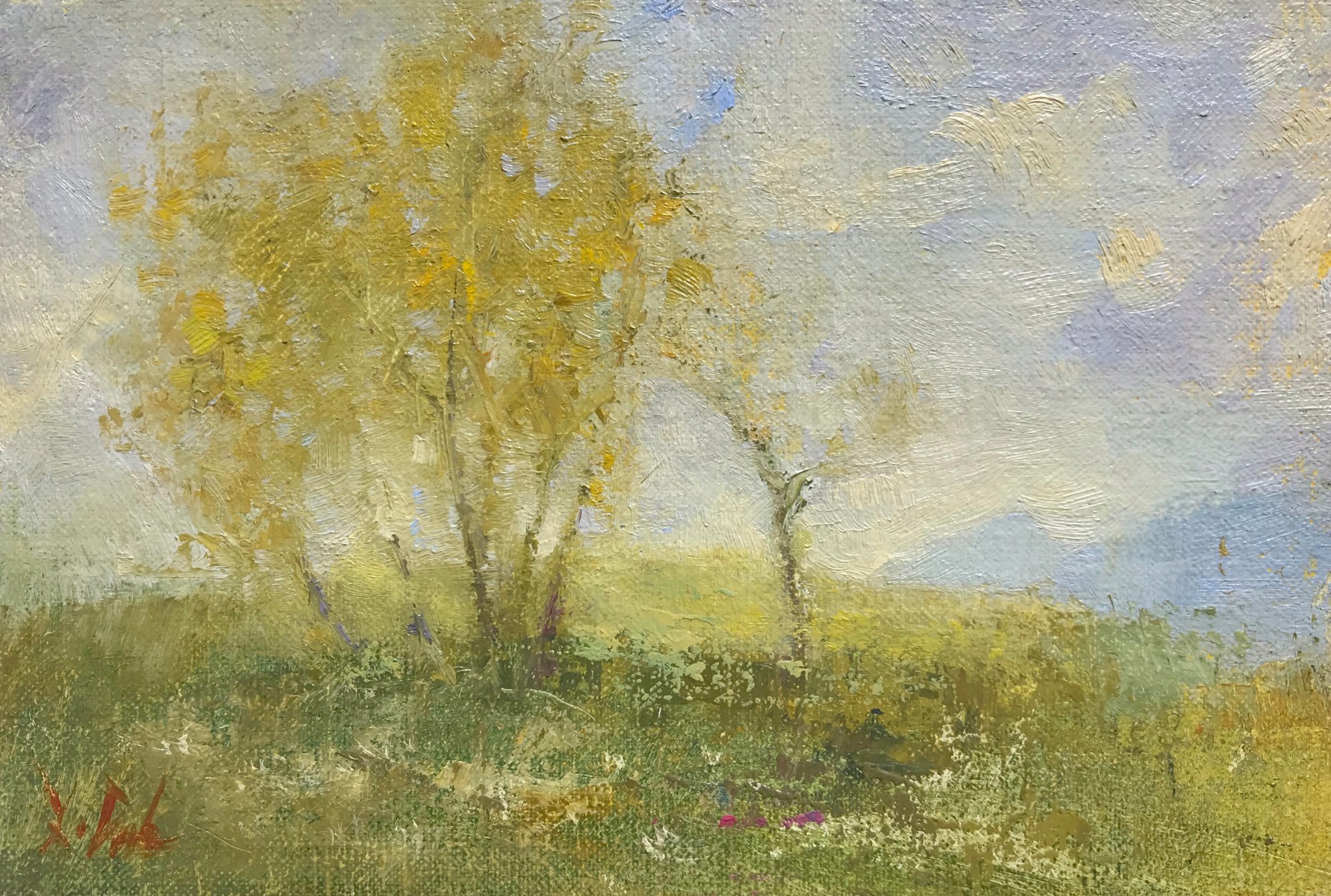 A group of small trees, dressed in their new leaves, breathe in the warm breezes of Springtime. Painted on location along west Oxford Rd. Boulder, CO.
