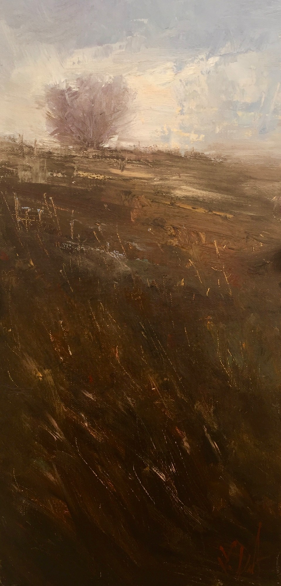 Dark earth and grasses contrast with the pale illumination of a winter sky and silhouette of a lone tree on a hilltop.