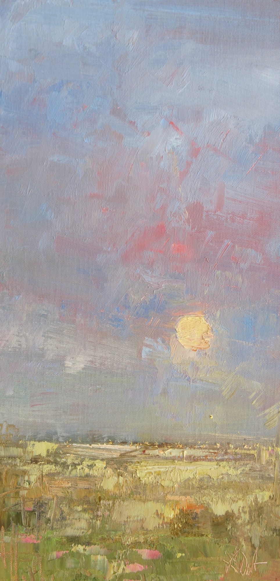 12 x 6" oil, plein air. One of 2017’s autumn “super moons” glows in the sunset sky east of Niwot.
