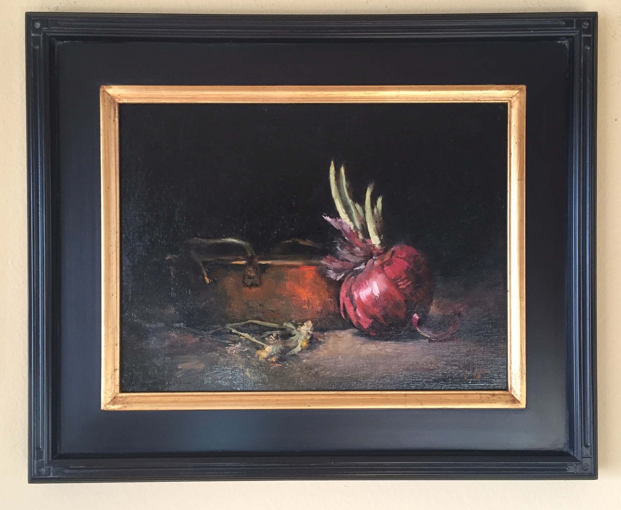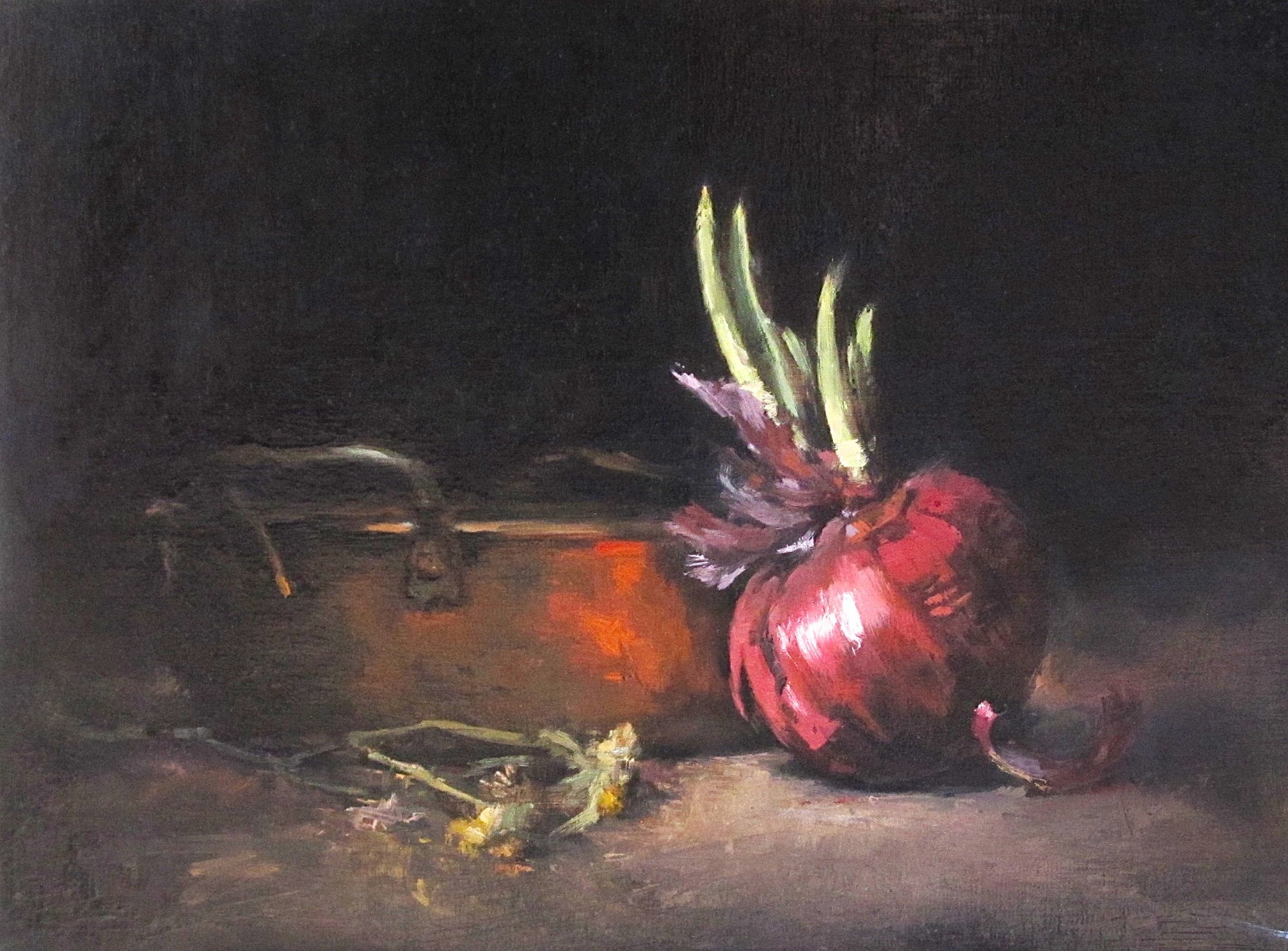 A red onion and copper pot, left waiting. And while we are distracted, life renews itself, ever hopeful...
