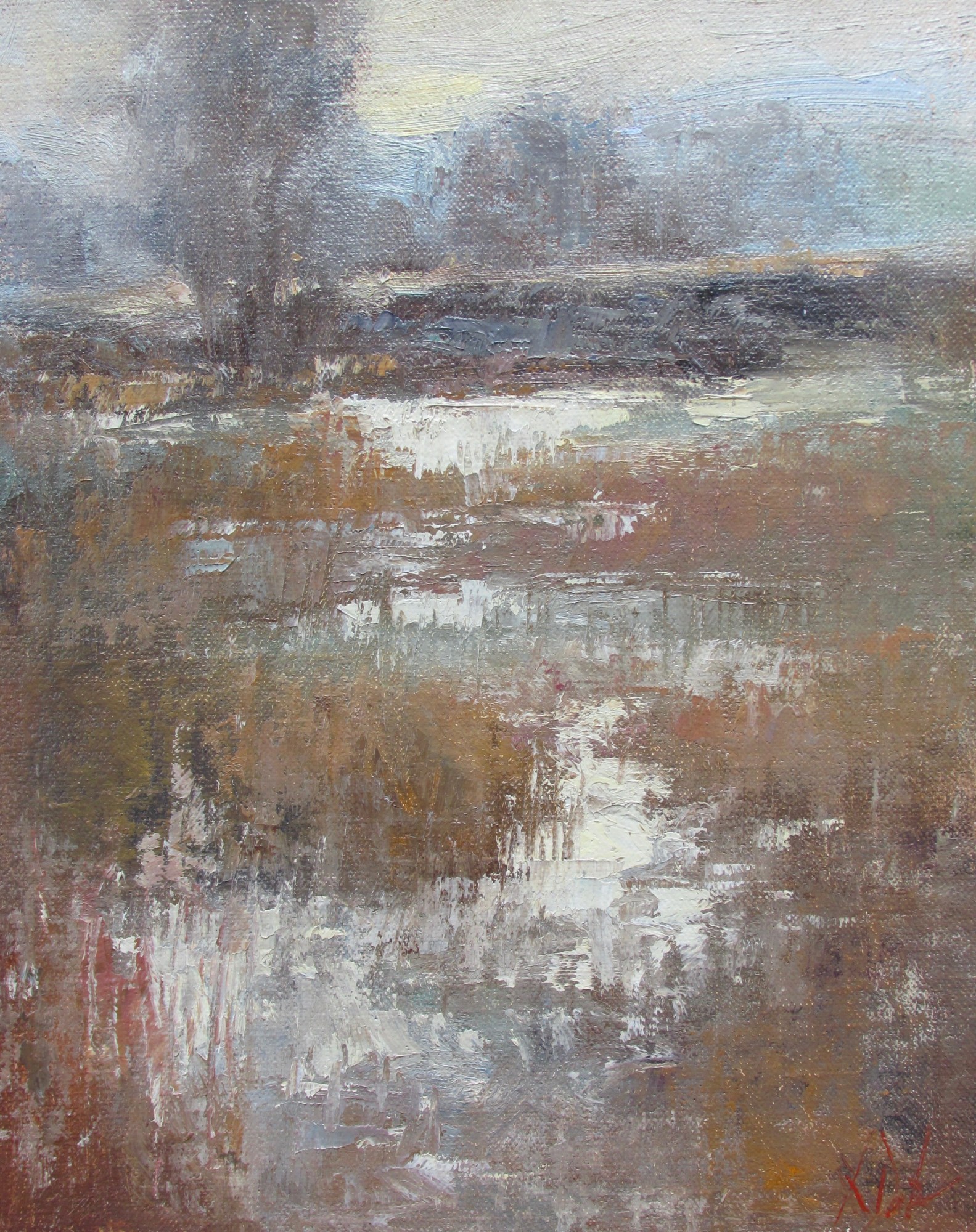 Ice and snow take us on a meandering journey through winter wetlands to the softly lit landscape beyond. See also: Winter Wetlands II, a companion to this piece, painted at the same plein air session.