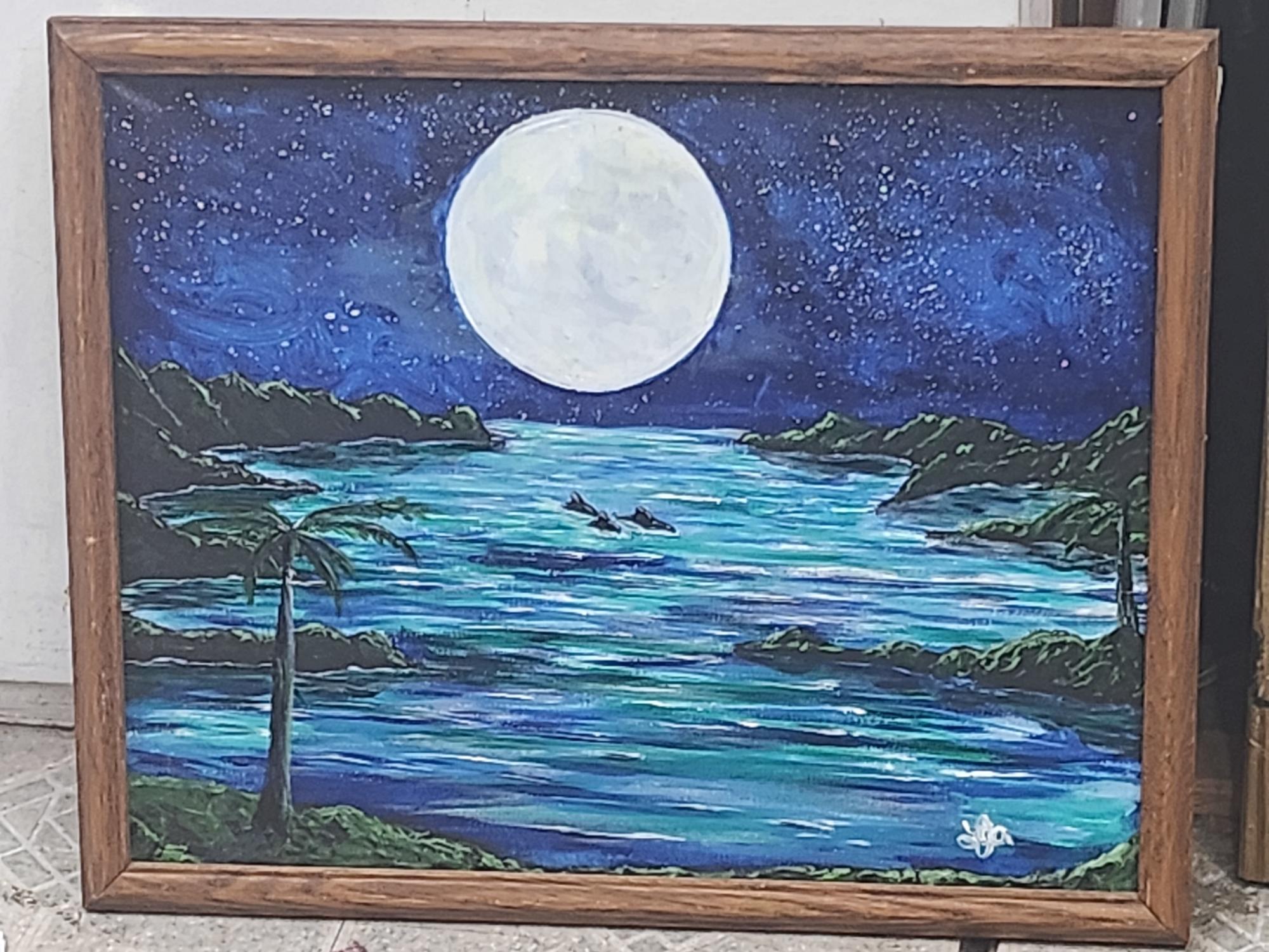 A beautiful painting of a moonlit harbor with dolphins playing and stars shining