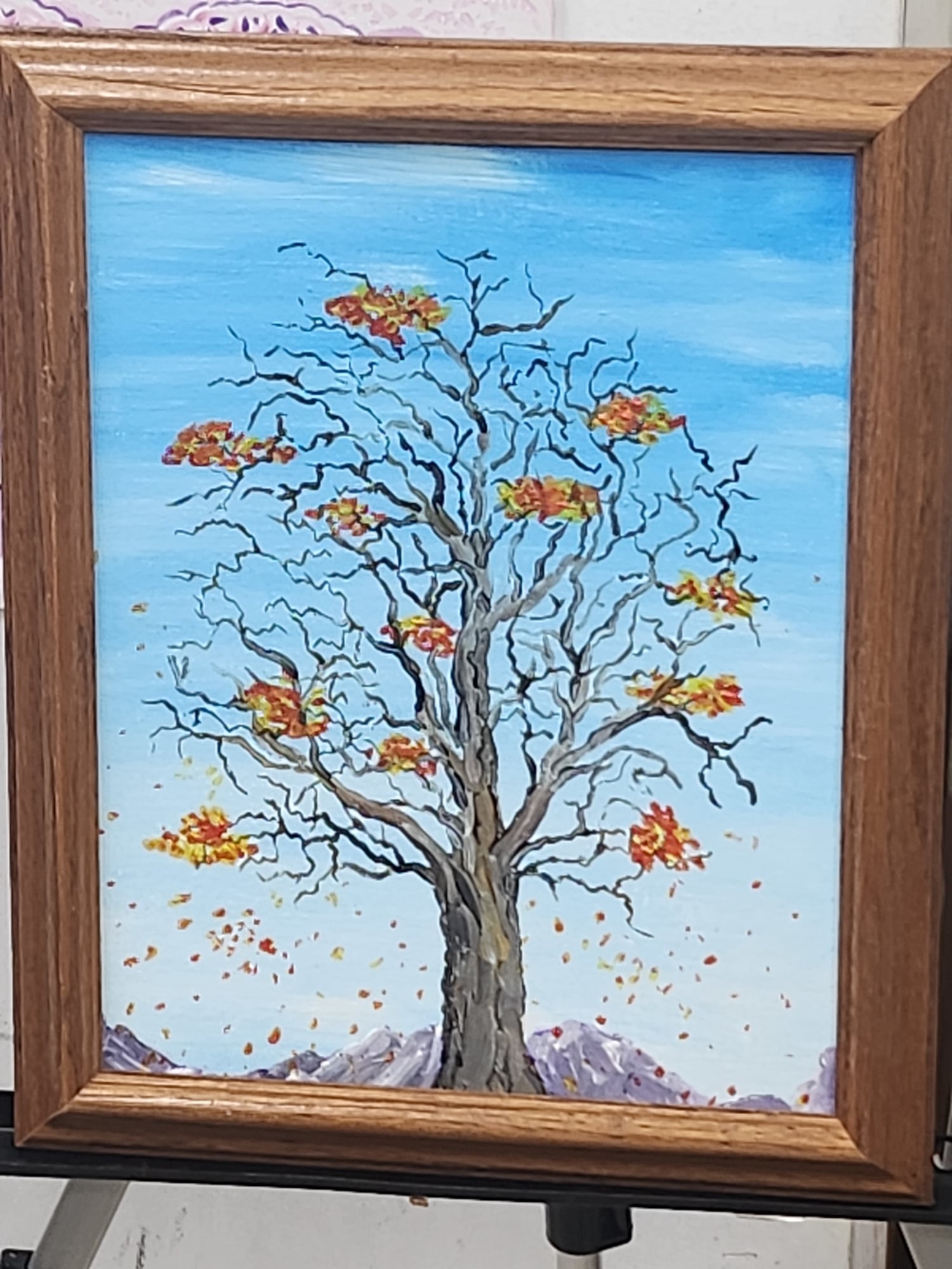 A whimsical painting of a tree in autumn losing it’s last leaves
