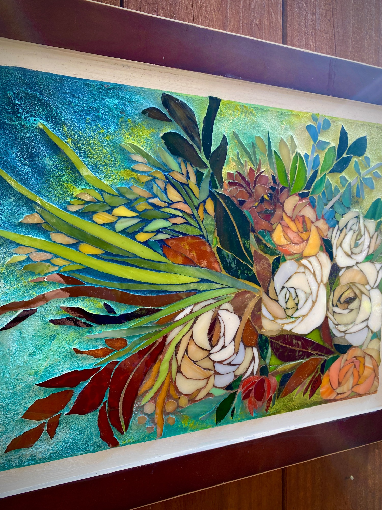 Creating stained glass mosaics with painted and textured grout backgrounds. Inspired by nature and anything floral.