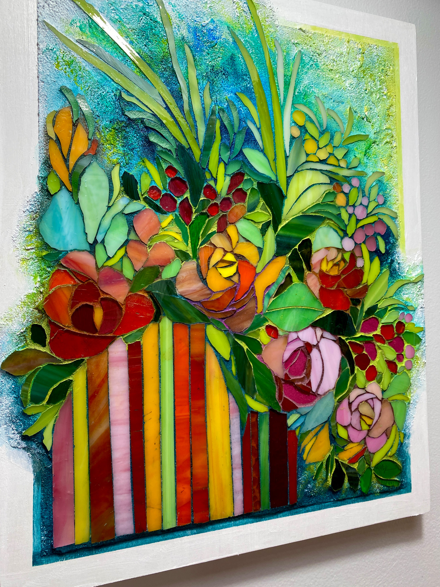 Creating stained glass mosaics with painted and textured grout backgrounds. Inspired by nature and anything floral.