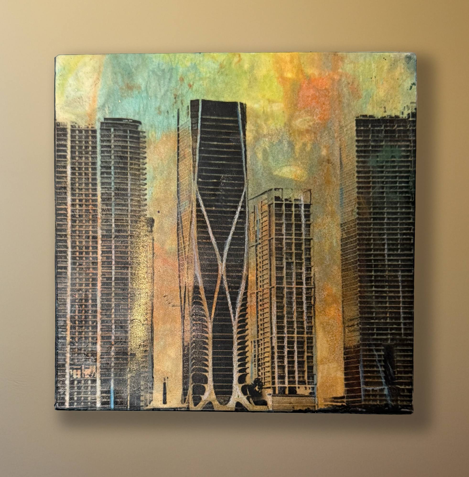 Print and mototype in Encaustic. A scene from the water in Miami viewing the One Thousand Museum and surrounding skyline.