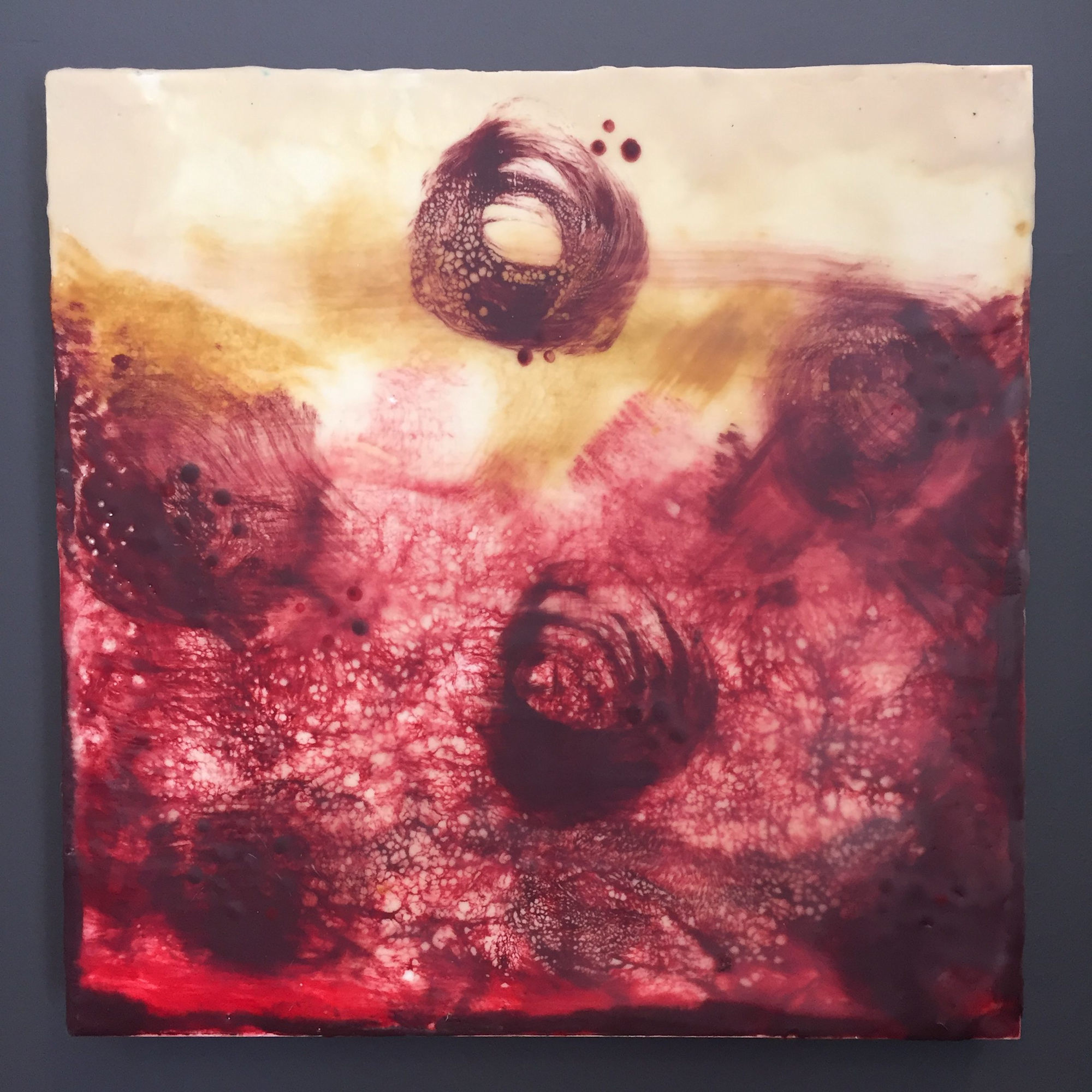 My first encaustic piece. All the movement is held in the red wax. The sides are painted black.
