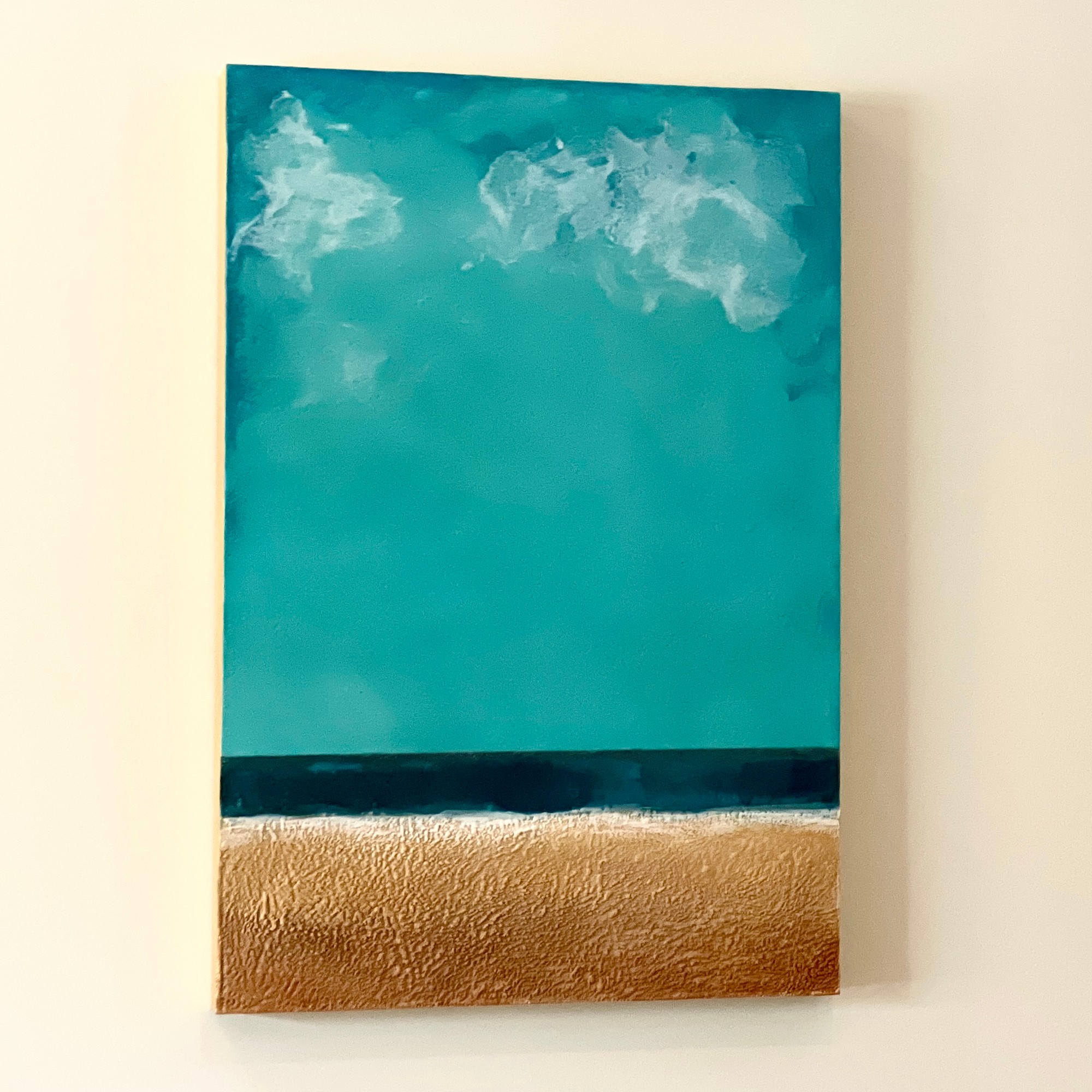 A modern coastal piece with a rich blue sky, deep ocean horizon, and textured gold sand. Created with encaustic medium on a deep panel, the sides are finished in gold for a polished look. This artwork is unframed but ready to hang.