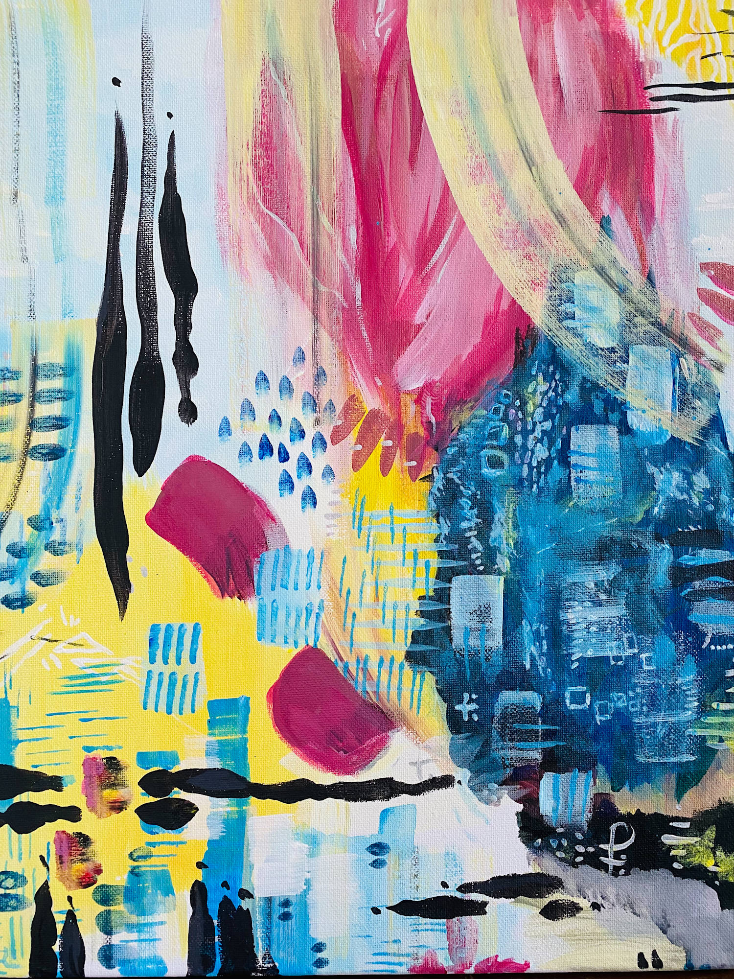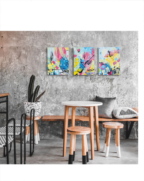 Within the playful dimensions of friendship, love and discovery, this artwork represents the qualities of each and every one of them. Created on the beautiful island of Corfu in 2023 and inspired by three lovely beings we met on the dancefloor of music garden, a place for community and movement in a wild area upon a hill, this triptichon brings a certain lightness to your space. May it inspire your freedom and your expression of authenticity. May it bring you close to heart and home. May it bring joy and creativity to your heart and soul.
