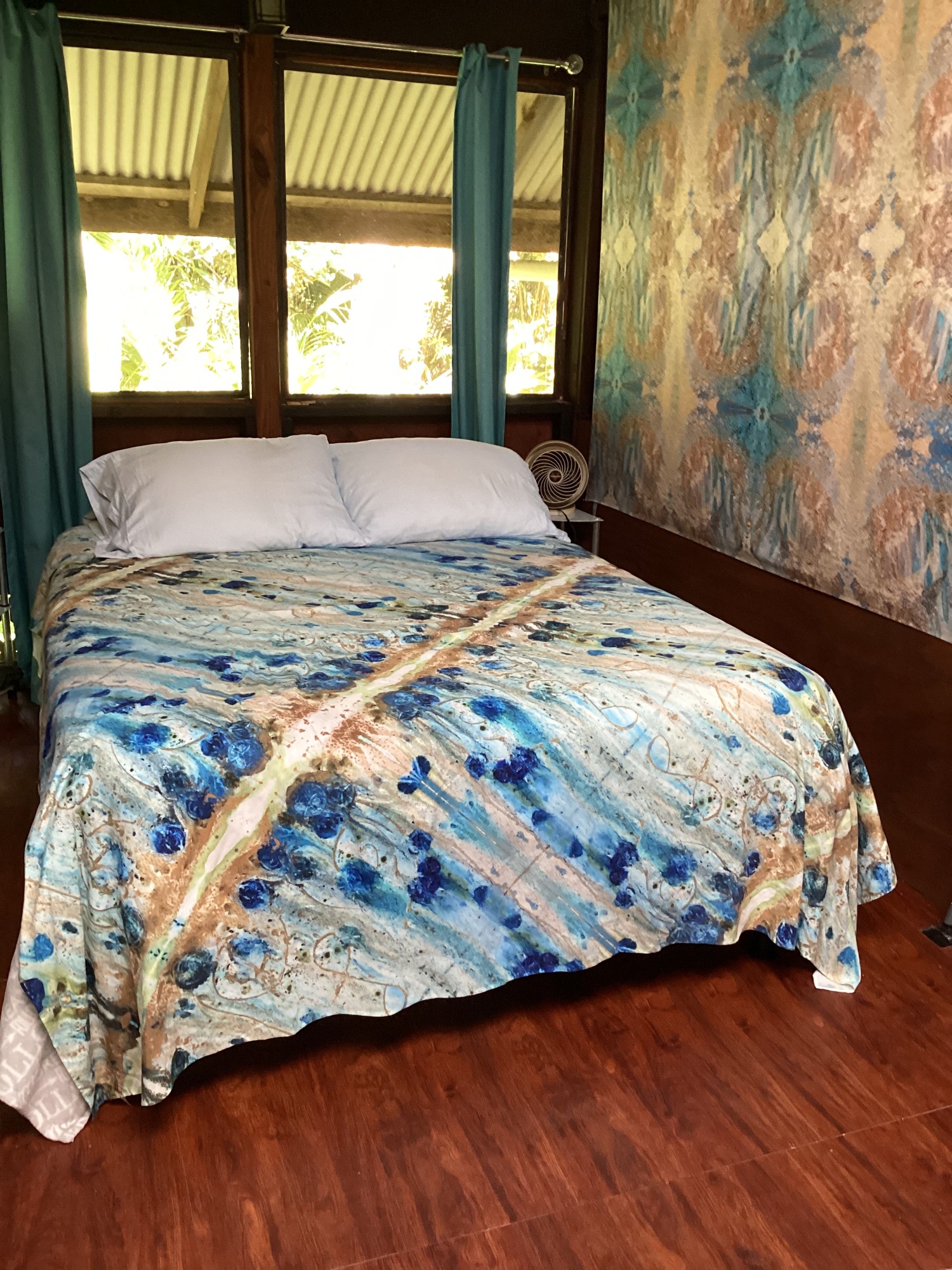 Enjoy this tapestry based upon my original painting, "Electric Universe". The tapestry image is made from my own professional photograph of my artwork and mirrored digitally to create an all over pattern. These tapestries look fantastic blowing in the wind on camping pop ups or as table cloths. I have even had friends use them as bedspreads and wall hangings.