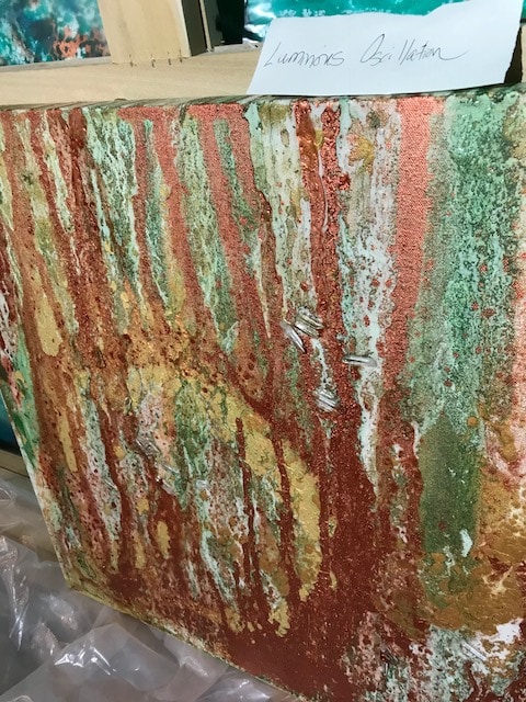 “Luminous Oscillation” radiates with the glow of gold and copper. Circling around are quartz crystal points creating beneficial vibrations into the space around this painting. When quartz is squeezed it produces piezoelectricity like in a quartz watch. This energy produces negative ions into the air that clears and cleanses the stale positive charge that has built up in the air. The effects of negative ions can also be felt in nature after rainstorms or sitting next to a waterfall. Fresh air and sunlight meet on this canvas plane as it was created outside.