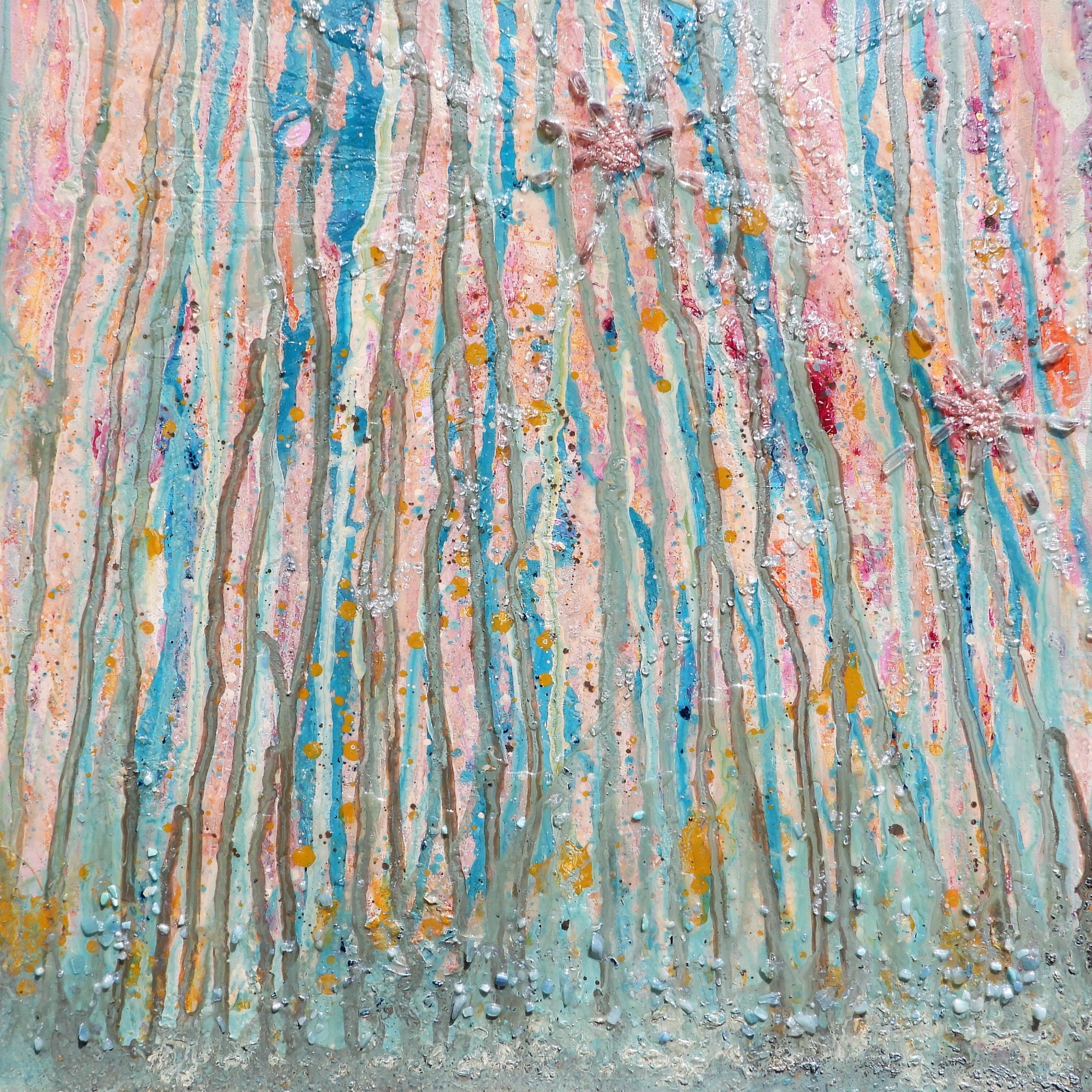 In this set of three, I am expressing the sensation of camping under a meteor shower on the edge of a mountainside overlooking the ocean during a music festival with friends. The connection to the Earth and the Sky through crystalline minerals, blue and pink light and portal sensation of the Cosmic Wave festival event in Hawaii, all combined together onto the canvas through my memory. Magical Passes refers to the Carlos Castenda books and a type of movement for magicians to build power and energy.