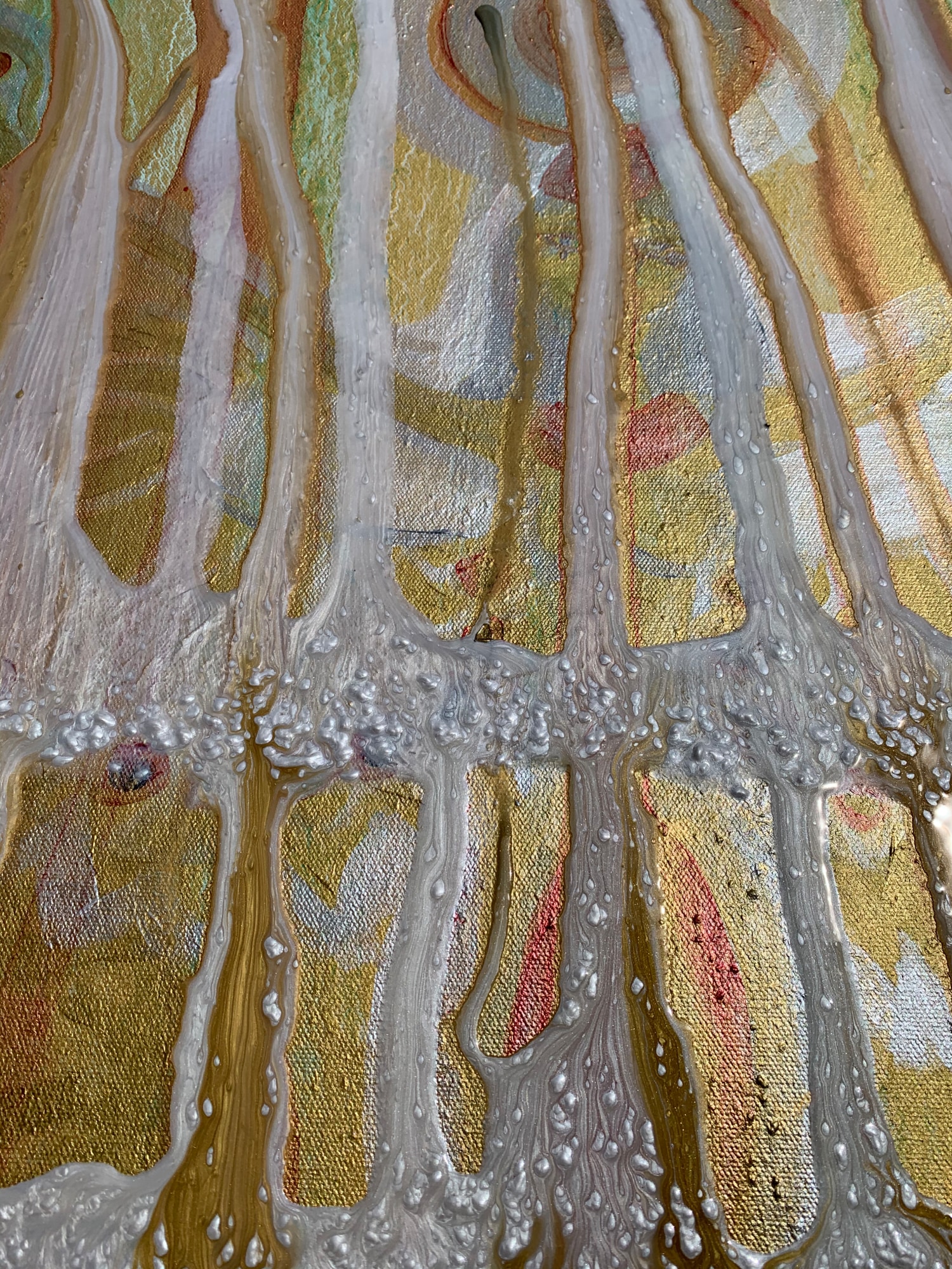 Laying on the beach. eyes shut, with my arms stretched out to the sides, a vision of myself as Isis grew in my mind's eye. A feeling of peacock feather wings and lion guardians flanking my sides. I was standing on a statue, the head or a Greek-Roman man. Powerful light formed over my head and then I opened my eyes and came back. Once home I did some research to find an image to match what I saw. There it was online, close to what I had seen it my vision, an Egyptian Goddess! I took to drawing and painting it over two months with the final result obscured like a dream vision, so that the abstraction brings you into the under layers slowly.