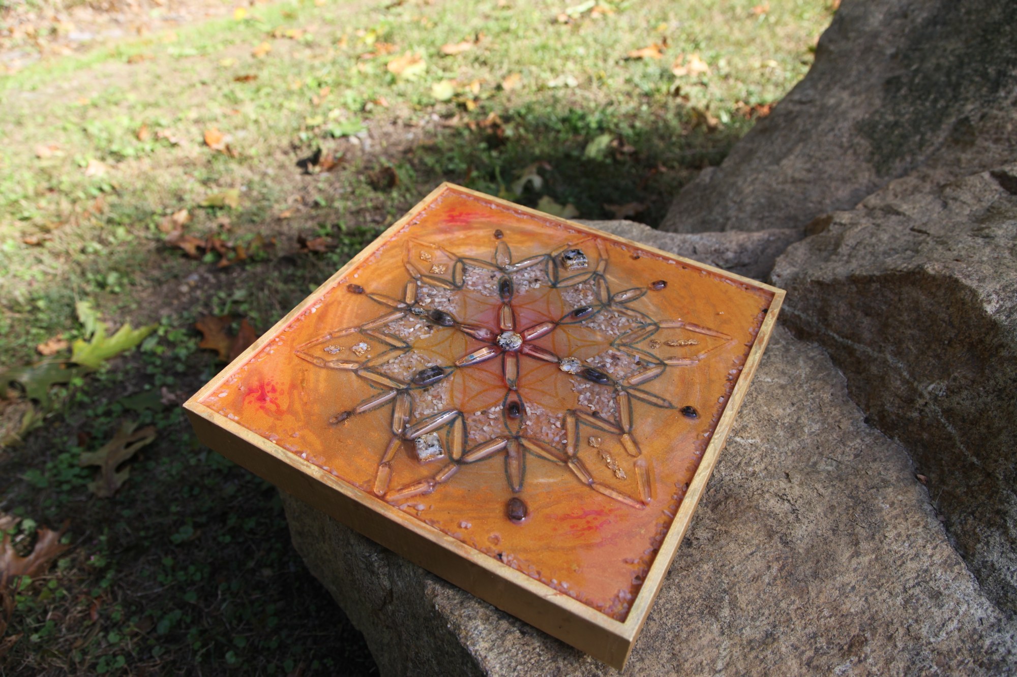 Flower of Life pattern as the under-painting, then lending itself to the grid of crystal embedded in resin. This pattern has been foremost in my art this year, as it is the image on my sound healing instrument, the 36" Flower of Life Gong. As a crystal grid, it serves to generate positive energy and includes the beautiful "organite" like jewelry of Kelsey Pardonner including opals and gold leaf. Her gift to me of these gem pieces, inspired the crystal grid in turn in a true collaborative effort.