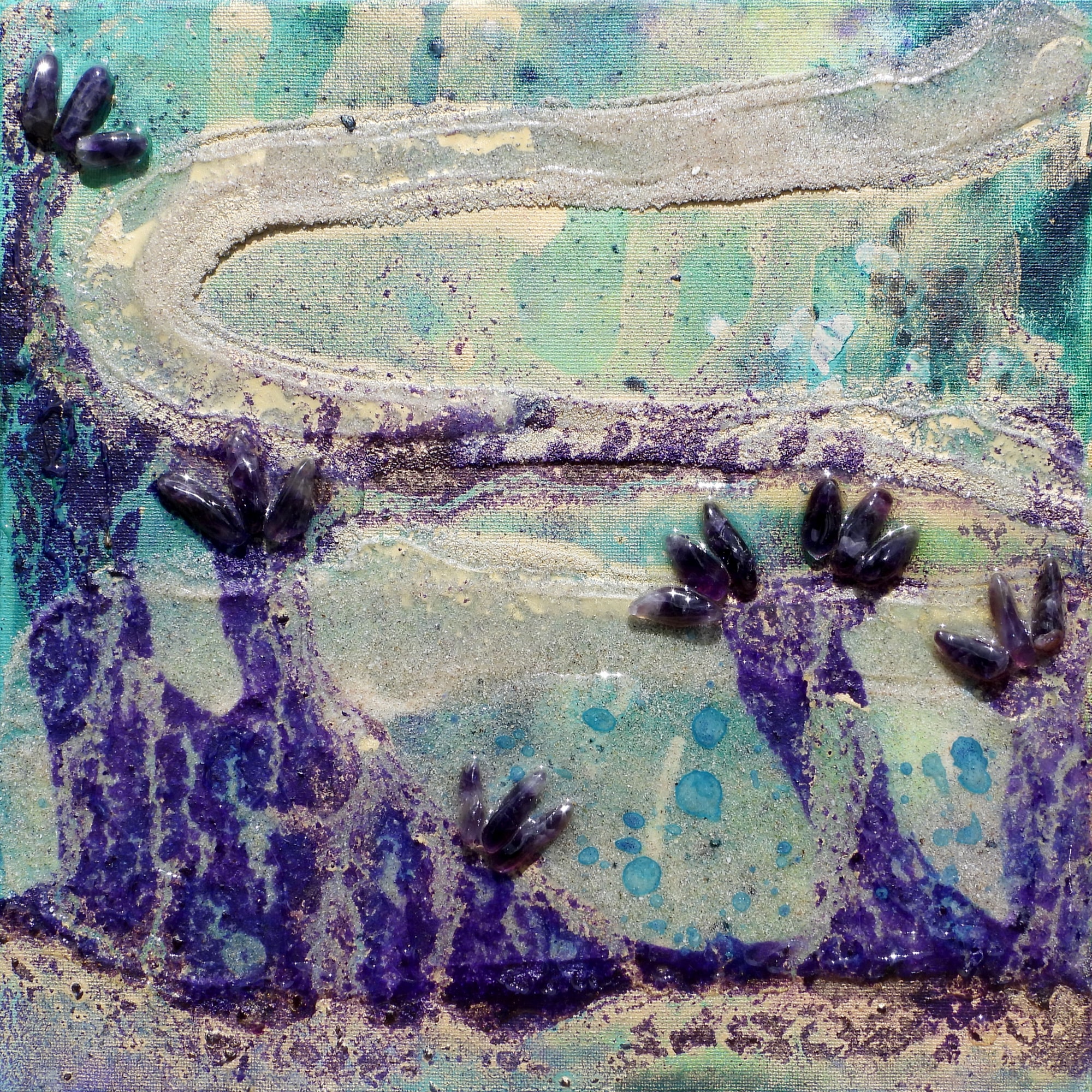 This series references concepts from Rudolph Steiner on a cosmological narrative about Venus and are my visual translations of this information. The story goes, Venus and Earth were merged in a higher fifth dimensional state, when Earth was considered Lumeria. This was a past time when beings were less dense and watery or jelly like. These paintings show various life forms and energy flows as filtered through the Venus light of 5D to our current time level in 3D. The Ultraviolet light of the sun I can feel, and I see colors when sun gazing, such as the change of white to purple to black. This series shows the Earth greens and Venusian blues and violets along with Atlantean like crystals that were used as a technology. I use resin to add an everlasting watery appearance and to squeeze the crystals creating a piezoelectric force. Pulling in past energies of the Venusian realm to the present solar forces, I present this artwork as spiritual technology, may it assist you to awaken from, or enter, an enchanted sleep, whatever is preferred.