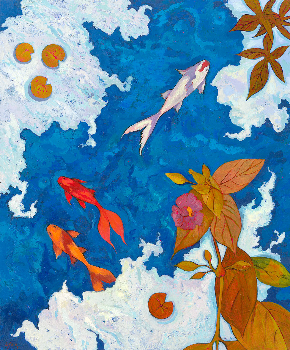 Each painting is partly inspired by my surroundings, but mostly they are a newly created world where magical things can happen. I start out with a general idea but am open to going with the flow of each creation. My dreams & imagination aid me in creating these surreal like lyrical worlds, one filled with color, joy and an underlying concern for the health of our beautiful earth.