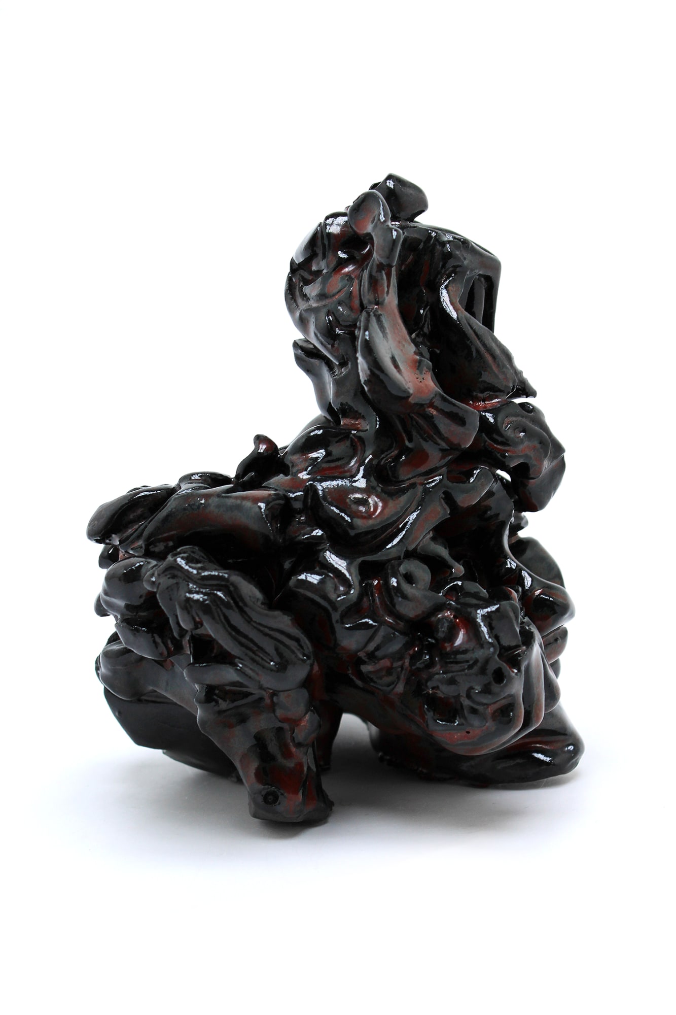 His glaze shows the depth of blacks and here and there you will perceive tints of fiery reds, reminiscing of ancient Chinese sculptures.