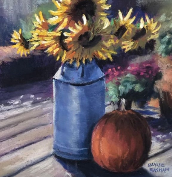 Sunflower bouquet in a vase that could have been an old-style milk container. Beside it is a pumpkin, and they are sitting on a wood deck or porch. The sunlight hitting the sunflowers really makes them the focal point in this piece