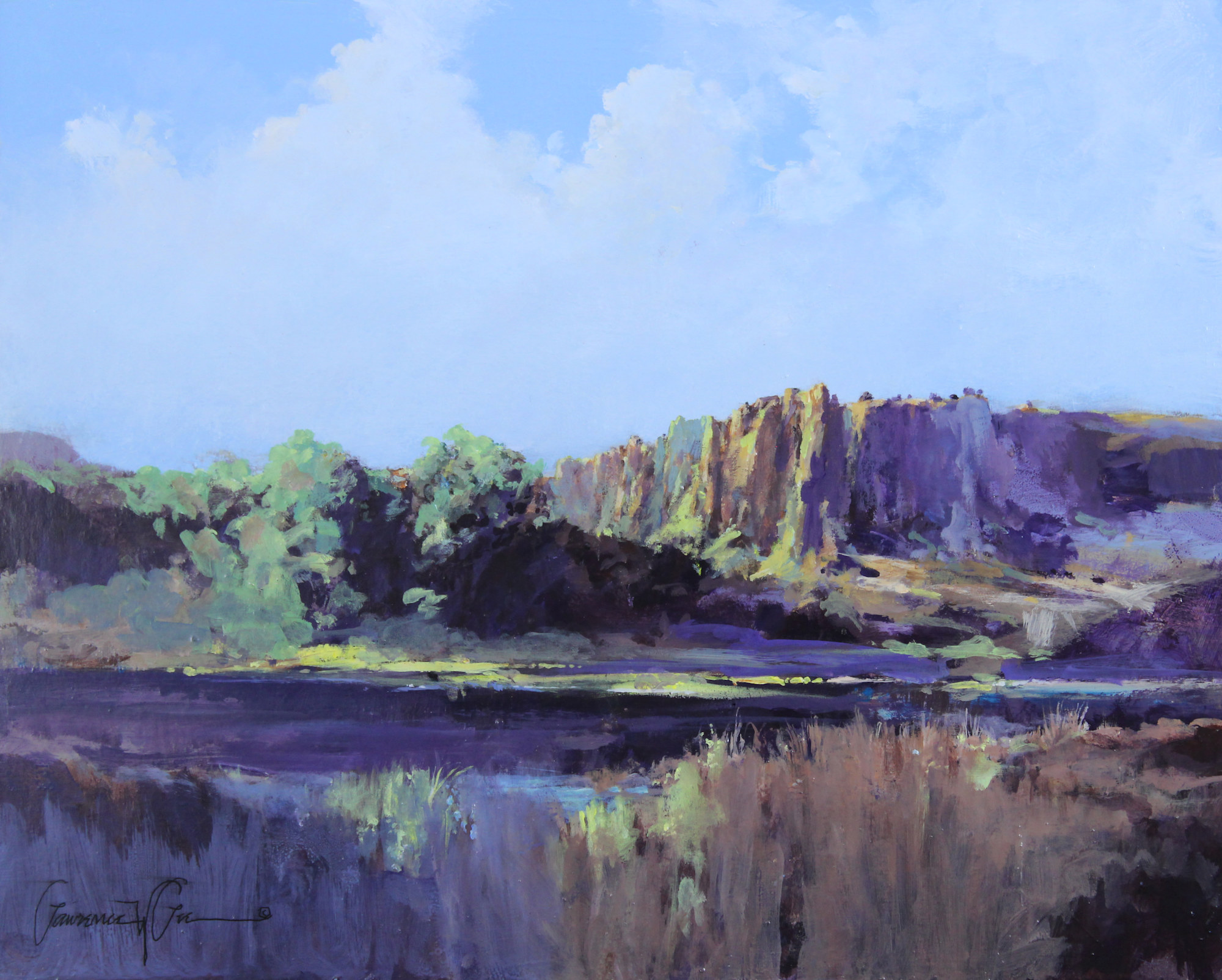 Beneath an endless azure sky, Lawrence W. Lee conjures a landscape suffused with tranquil majesty and resonant color. Cliffs, carved by time and sunlight, glow with golden ochre, lavender, and hints of indigo, standing sentinel over a quiet expanse of reflected water. Shadows and light intertwine on the land, where green foliage softens the gravity of stone, and grasses, rendered in earthy russet and gentle green, whisper at the water’s edge. The stillness of the surface below mirrors the drama overhead—a theater of billowing clouds floating in endless blue. Each aspect of the scene feels illuminated from within, capturing the fleeting hour when day yields to the hush of evening. The interplay of color and form draws the eye, inviting contemplation of nature’s permanence and its ever-shifting, ephemeral moods. Lee’s landscape becomes a meditation, a luminous poem of place, serenity, and quiet grandeur.