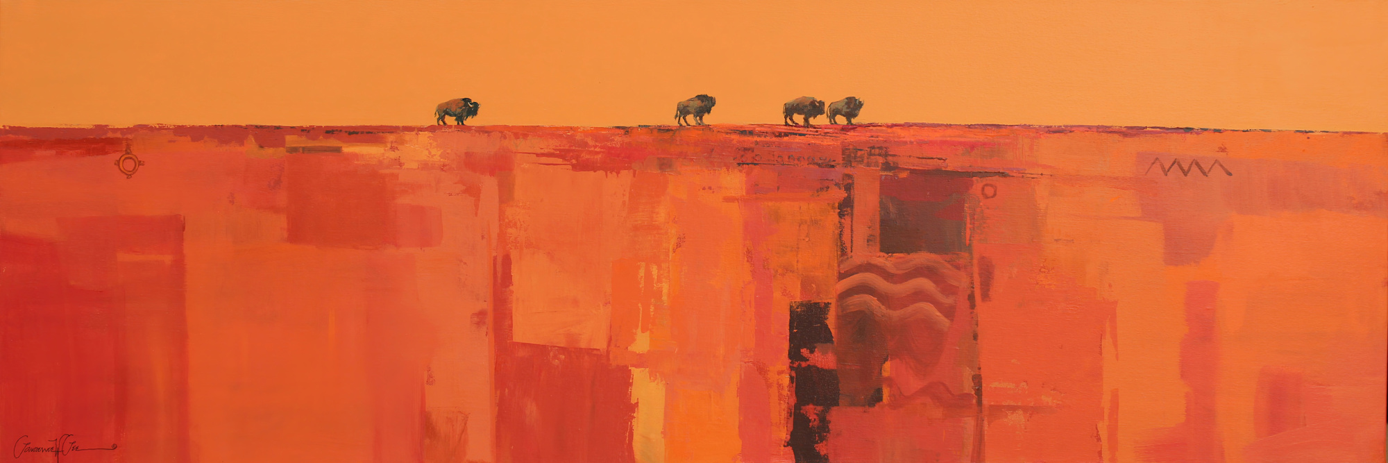 Silhouetted against this luminous horizon, a small procession of buffalo moves with timeless dignity—dark sentinels traversing the sacred landscape like ancient memories made manifest. Their presence anchors the composition in both place and spirit, embodying the enduring connection between creature and creation that Lee so masterfully captures.