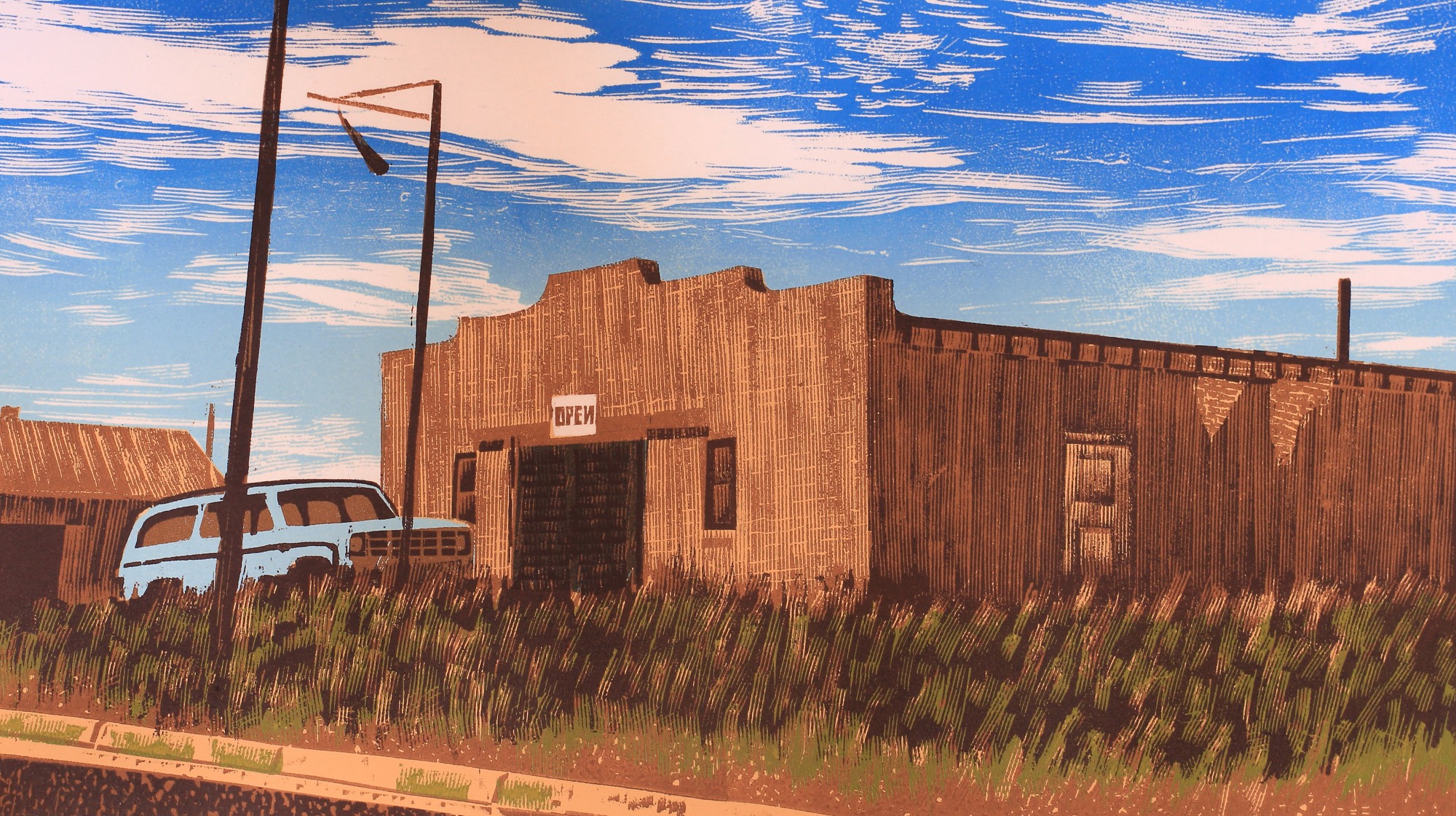 Tony Lazorko (1935–2017) created multicolored woodcut prints with scenes of America from Philadelphia to St. Louis to the American West in Mesilla, New Mexico.