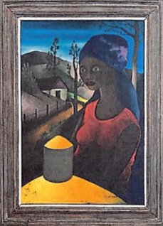 This painting was made using oil paints on masonite, or hardboard. Gourgue was never formally trained, but managed to master many academic painting techniques while staying true to his style. The visuals in Woman with Light, like in most of his paintings, provide a surrealist view of his country and his life. In the book La Peinture Haitienne, his work is described as haunting and as reflecting “an anguished man’s sense of the tragic.” The deep shadows and the woman’s still expression against the golden light contribute to this haunting, surreal mood.