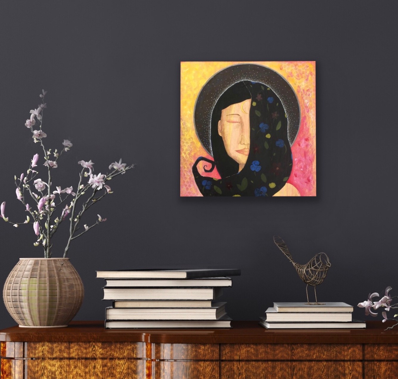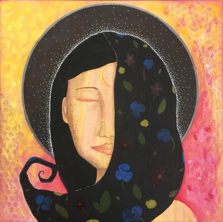 "Awakening" is an original, one of a kind mixed media painting on wood. It is 12" x 12" with a nice 1.5" cradle. I used collaged paper, acrylic, pencil, and ink. It is sealed with several protective layers of clear acrylic varnish. The back is signed, titled, dated, and wired up so it is ready to hang in your home.