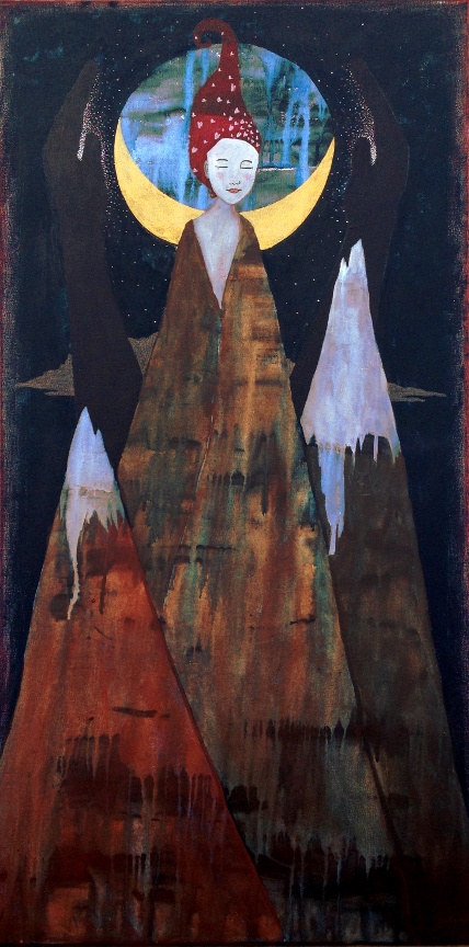 She rises from the mountains, steady, with wings made of crescent moon. Healing hands guide her through the night.