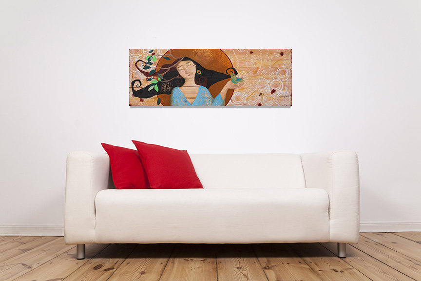"Storyteller," is a one of a kind, original painting. I created it using a variety of mixed media including acrylic, collage, and more on a solid 48" x 18" (approximately) wood panel. The mediums are carefully layered for maximum archival quality. It is signed, dated, and titled on the back.