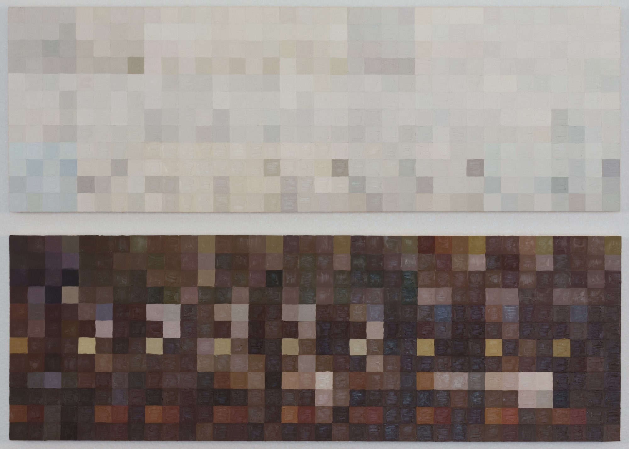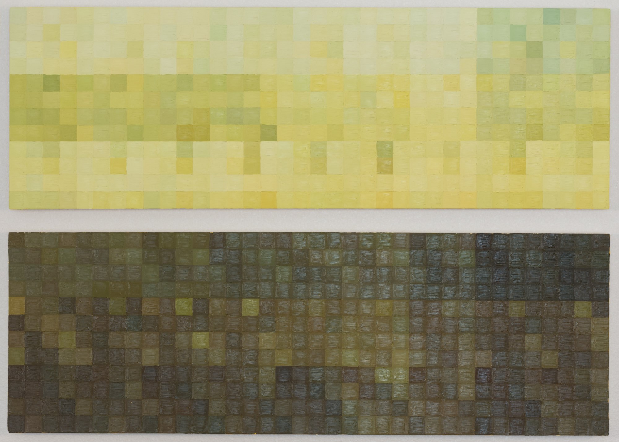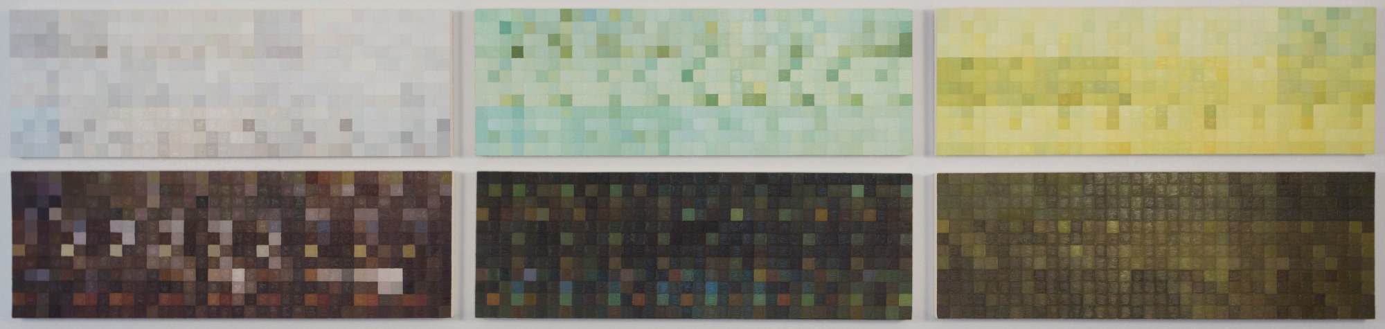 Finally, the digital translations of the colors were rendered in oil paint, a process that takes the image from a technological interpretation back to a perceptual human experience. Ambient’s top panels consist of the colors of the white rock affected by the water and ambient colors of the forest and sky. The bottom panels are the colors collected from images of the creek bed at specific gridded points on the photograph. The colors in both panels are arranged by correlating time and rounds in squares of 16 distinct colors taken from each captured moment.