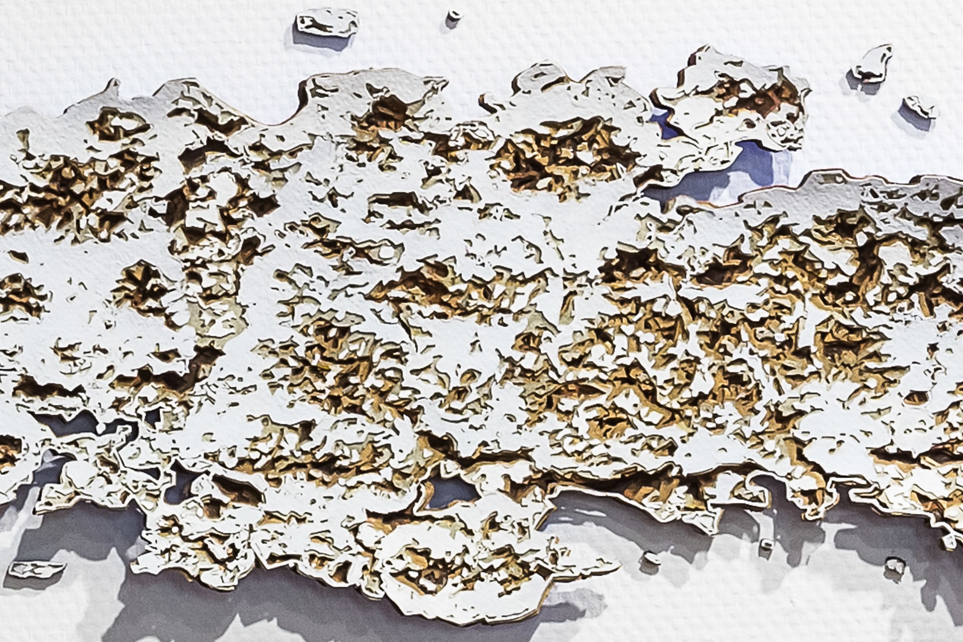 I manipulated the size of the fungus to 36 times its actual size and isolated it from its original surroundings of the log to investigate its form without distraction. Most of this fungus is hidden. I increased the scale to be able to explore the structure of the fungus beyond the form that is accessible to my eye and I have found that it has a pocketed body that is simultaneously exquisite and grotesque. Recompose is built layer upon layer of paper. Each layer cuts away windows to the layer underneath, as rot has created windows into the layers of wood. The process of making it is like creating a door that leads to deeper layers and complexity of understanding.